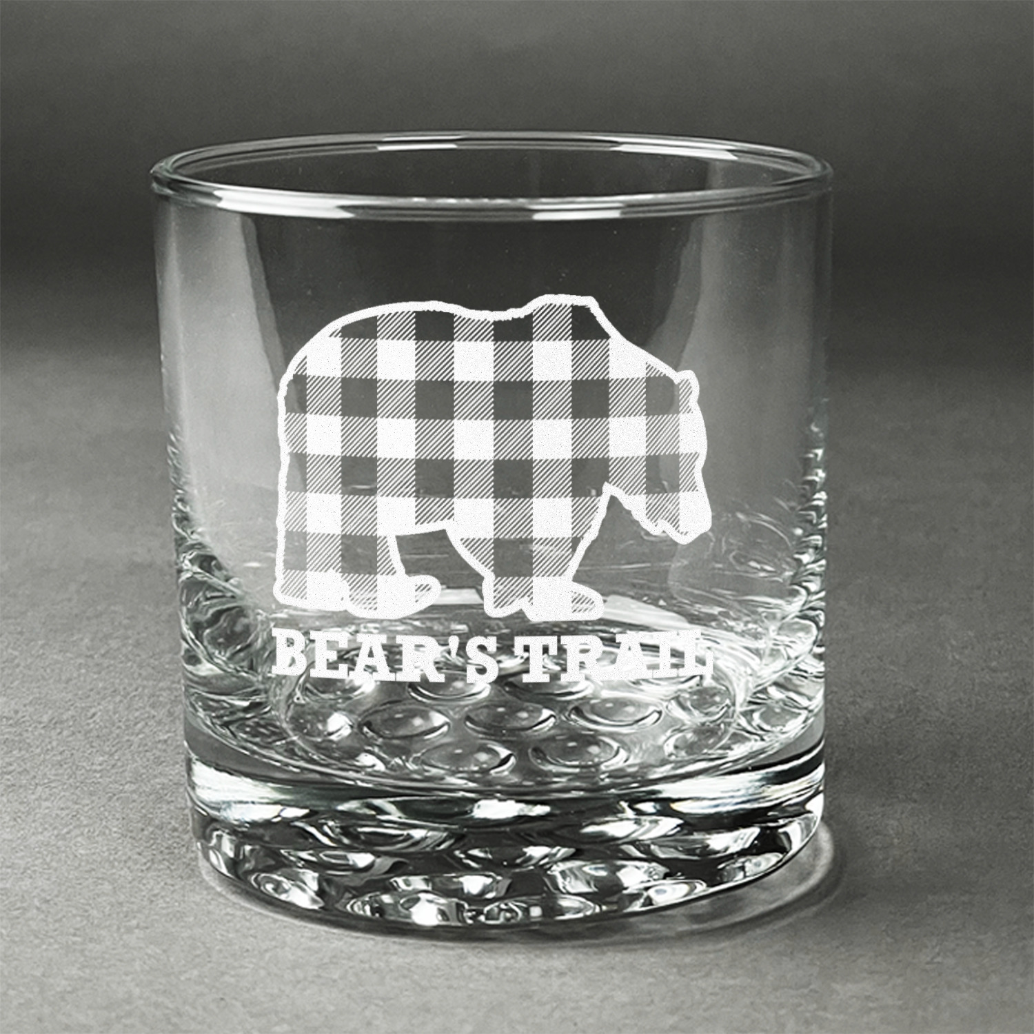 The main design is split into two asymmetrical sections. The top section is a diagonal red and black plaid, while the bottom is a light wood texture. On top of the wood texture is where your graphic and personalization go! The bear graphic and text below are filled with another black and red plaid.
