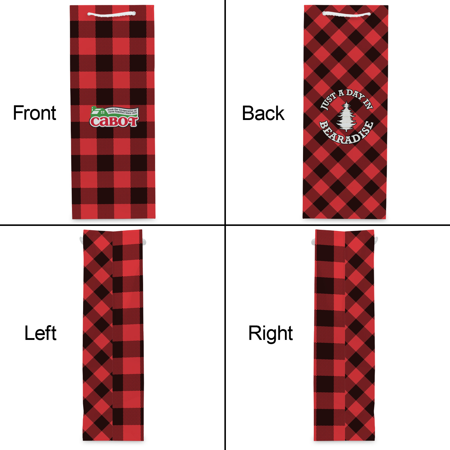 The main design is split into two asymmetrical sections. The top section is a diagonal red and black plaid, while the bottom is a light wood texture. On top of the wood texture is where your graphic and personalization go! The bear graphic and text below are filled with another black and red plaid.
