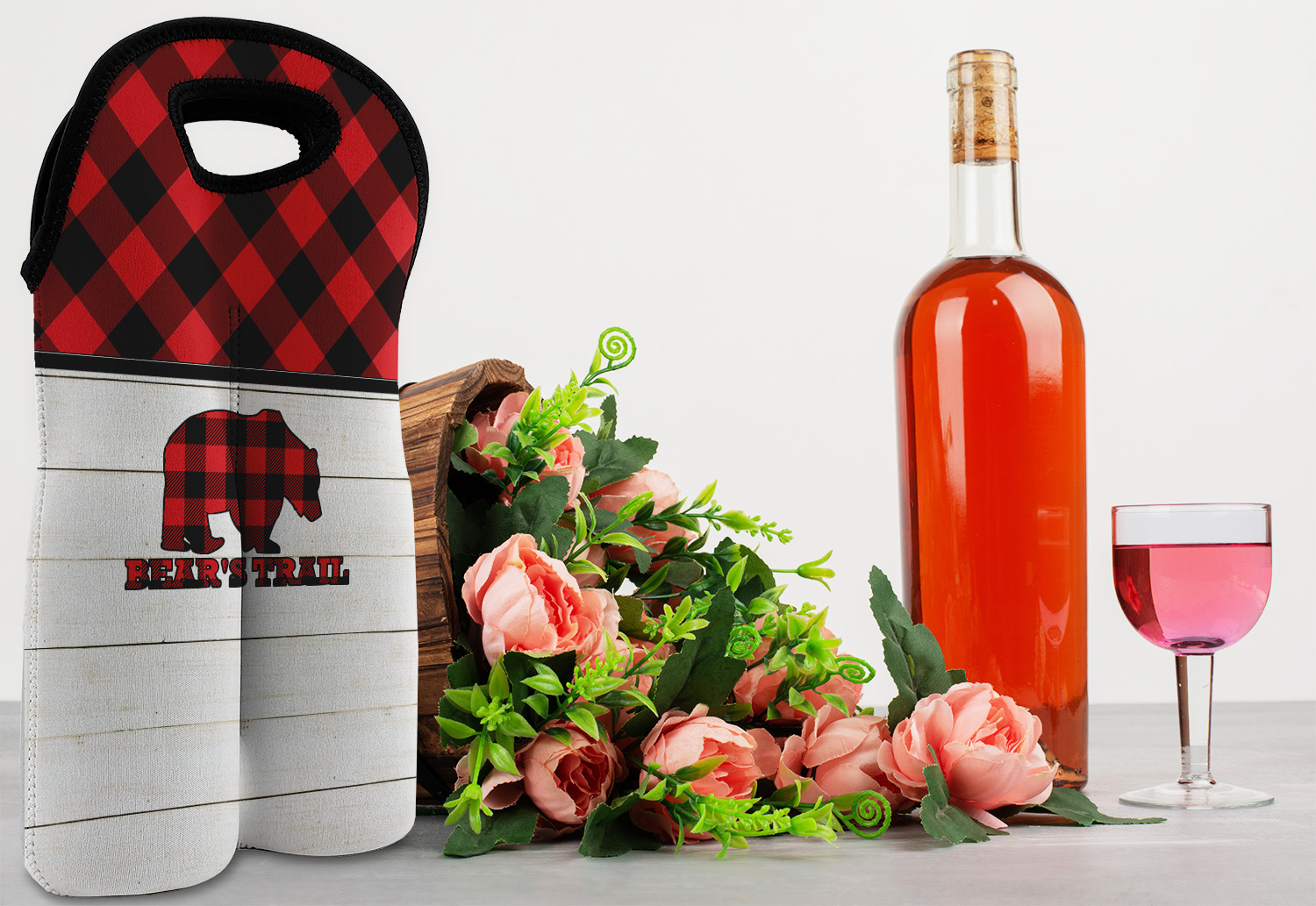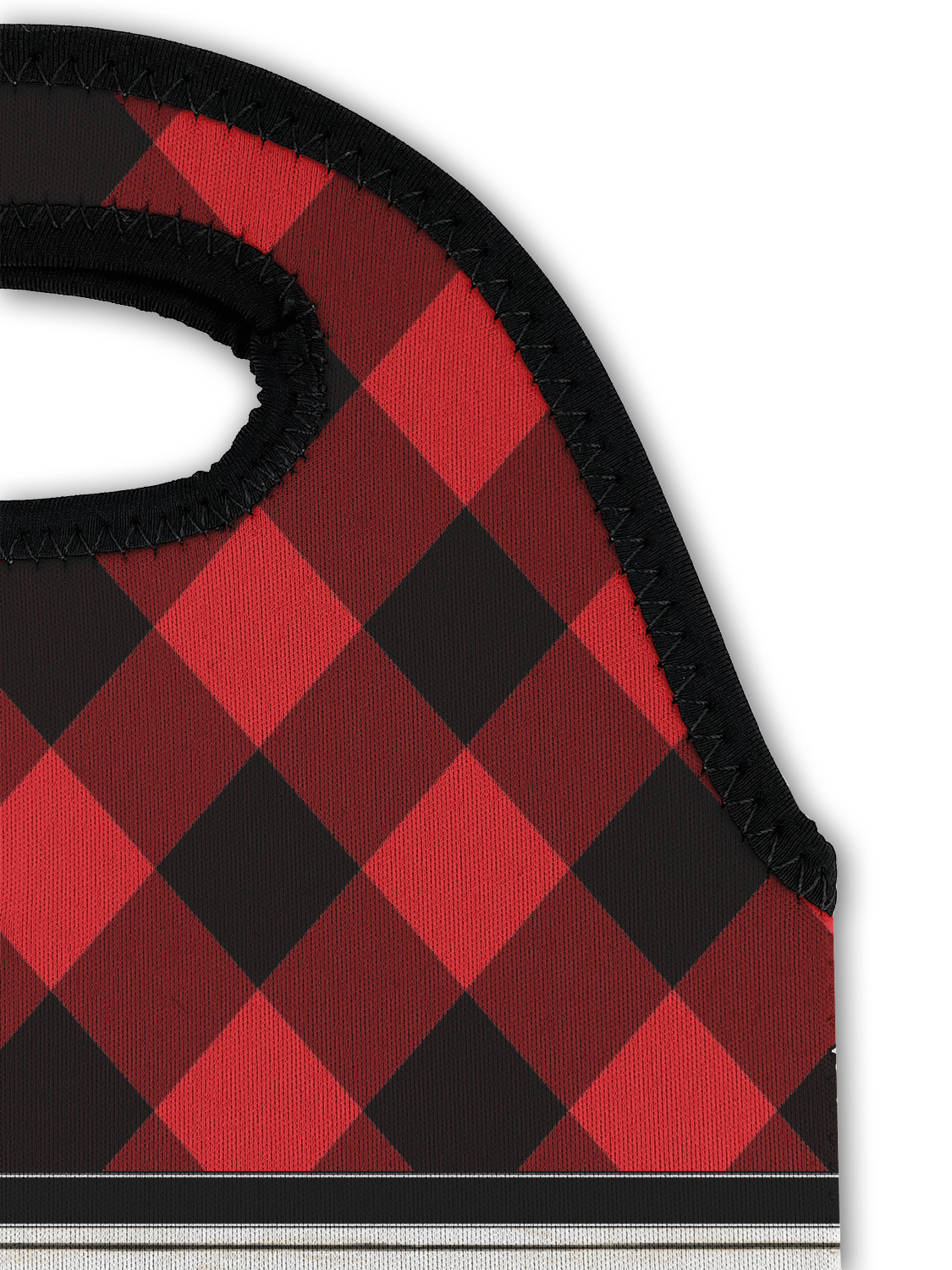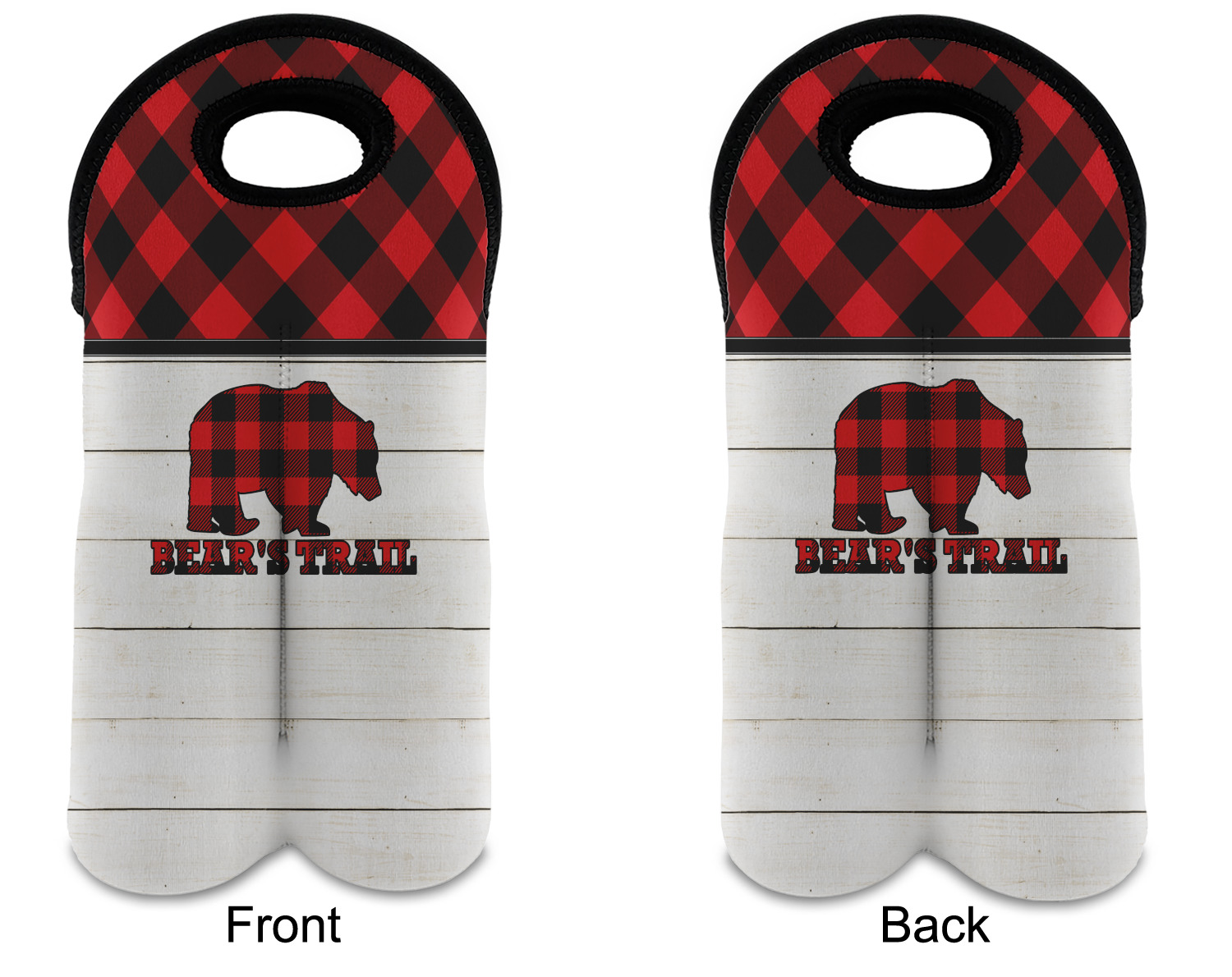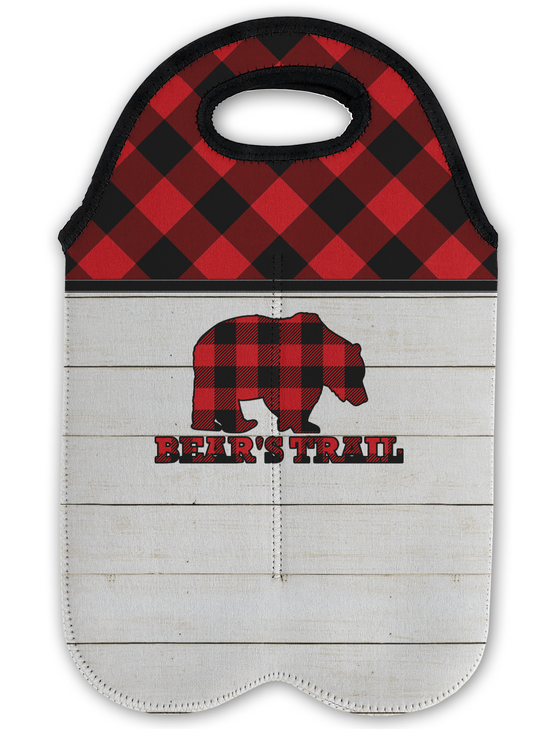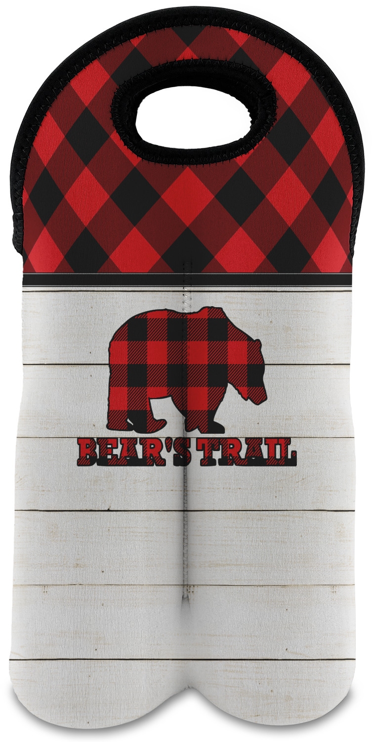 The main design is split into two asymmetrical sections. The top section is a diagonal red and black plaid, while the bottom is a light wood texture. On top of the wood texture is where your graphic and personalization go! The bear graphic and text below are filled with another black and red plaid.
