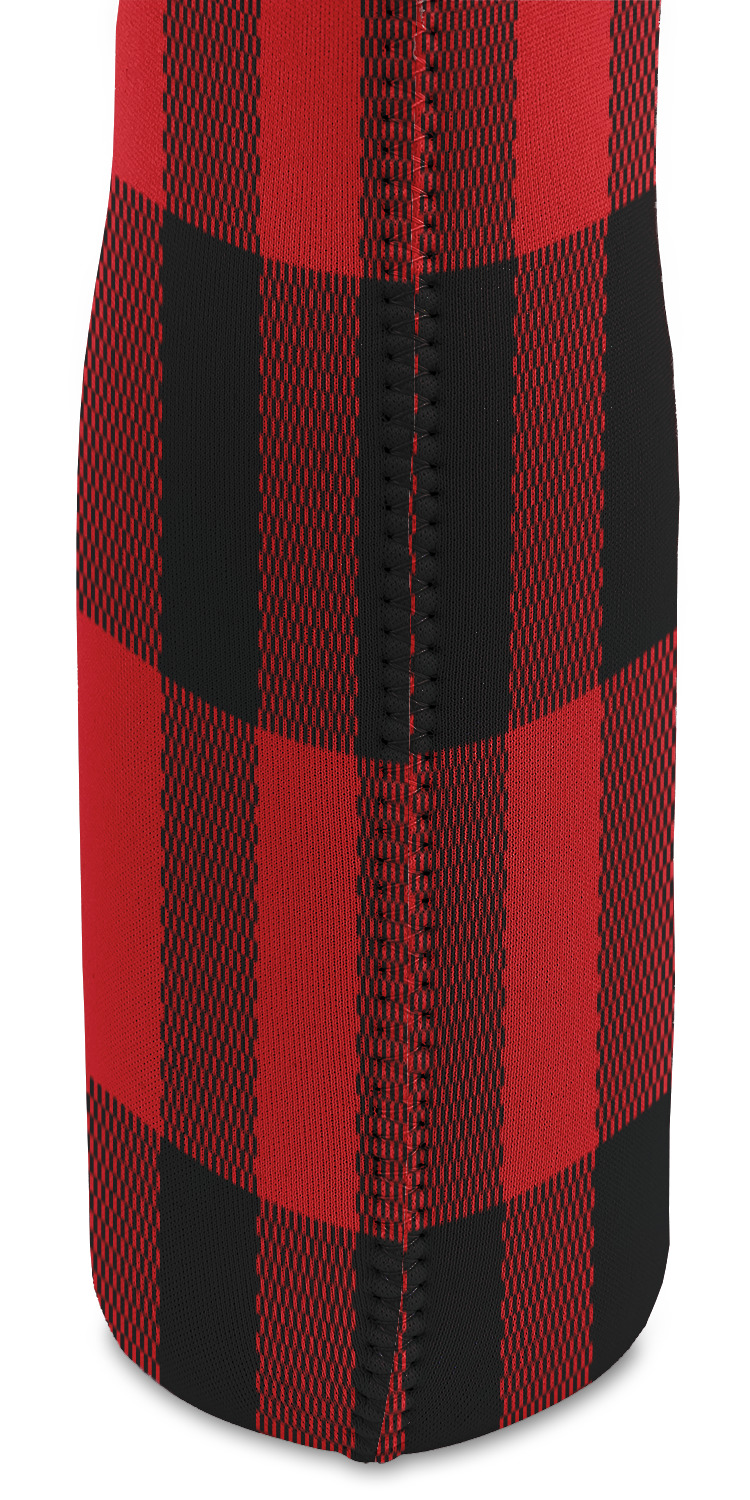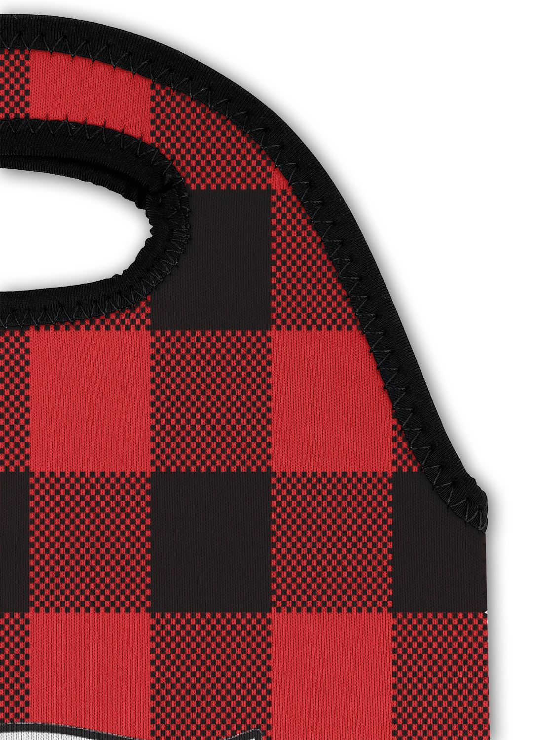 The main design is split into two asymmetrical sections. The top section is a diagonal red and black plaid, while the bottom is a light wood texture. On top of the wood texture is where your graphic and personalization go! The bear graphic and text below are filled with another black and red plaid.