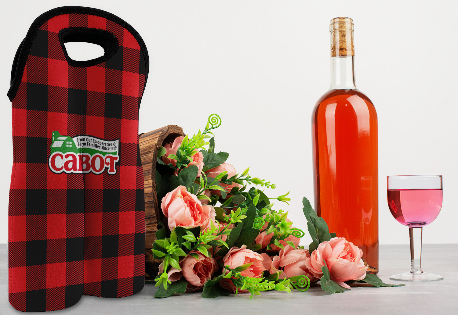 These tote bags are insulated to keep the bottles cold and have a stitched separation down the middle and double handles to keep the two bottles safe and secure during travels.