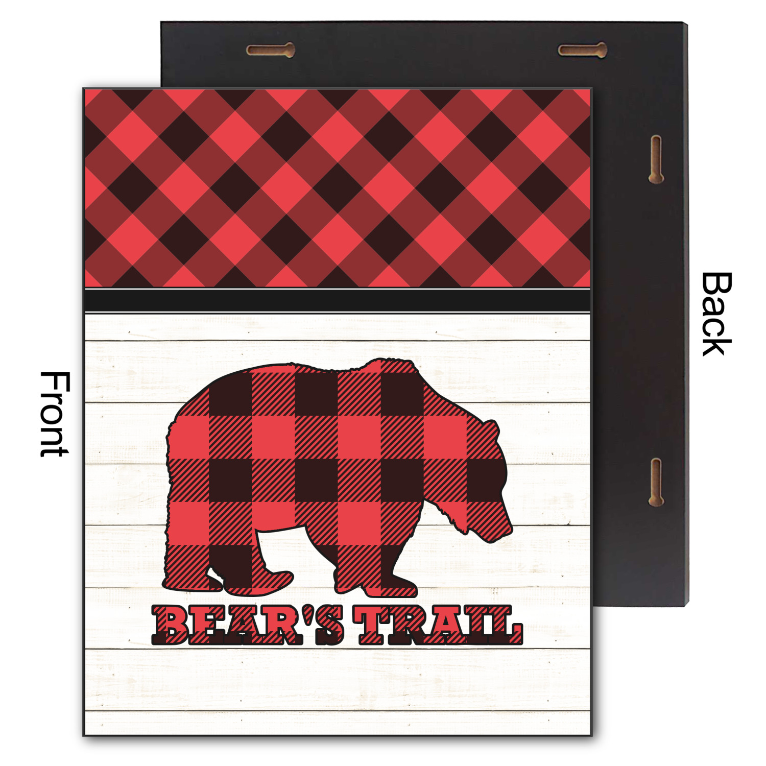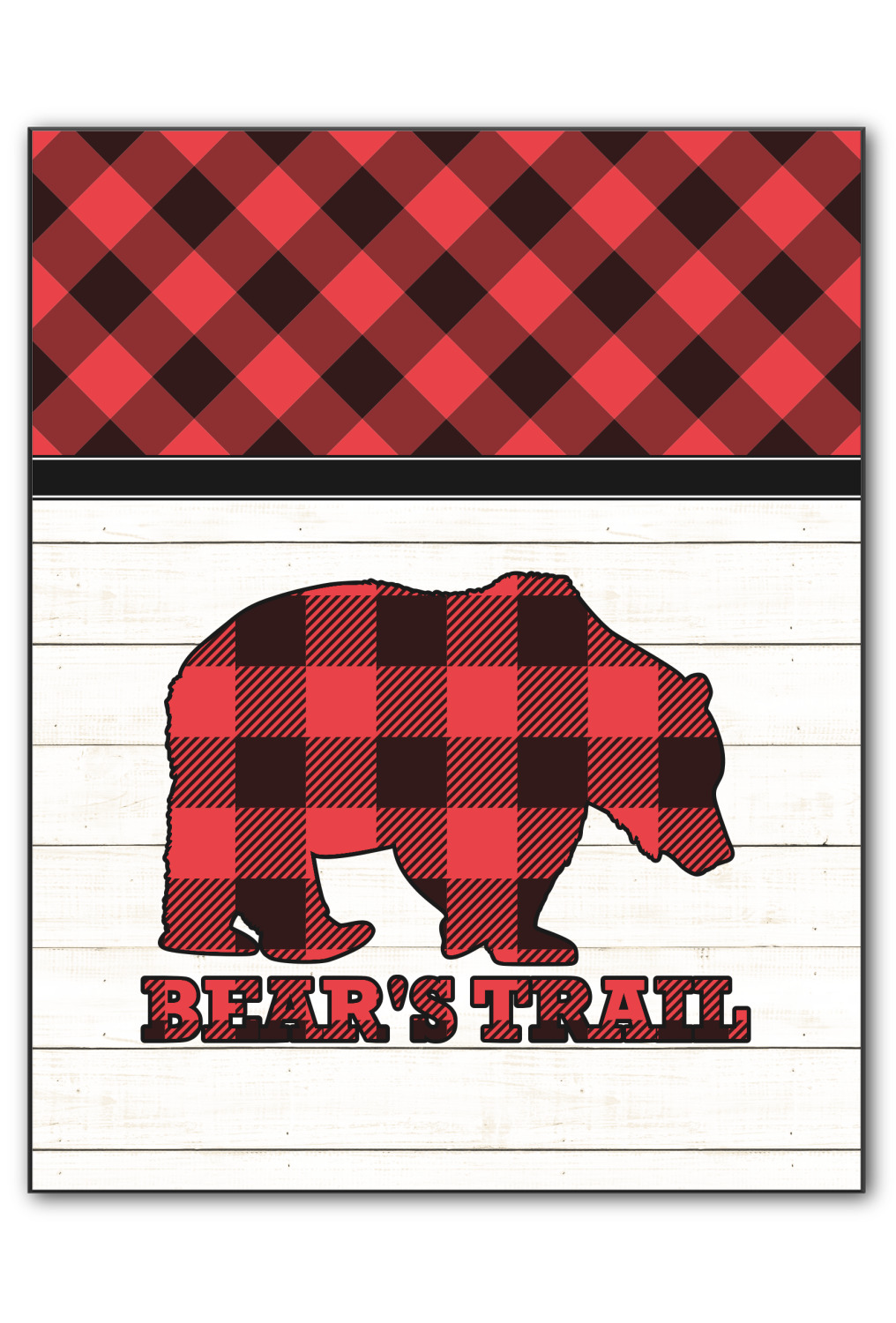 The main design is split into two asymmetrical sections. The top section is a diagonal red and black plaid, while the bottom is a light wood texture. On top of the wood texture is where your graphic and personalization go! The bear graphic and text below are filled with another black and red plaid.