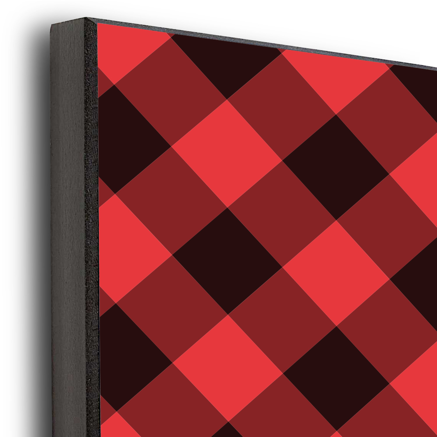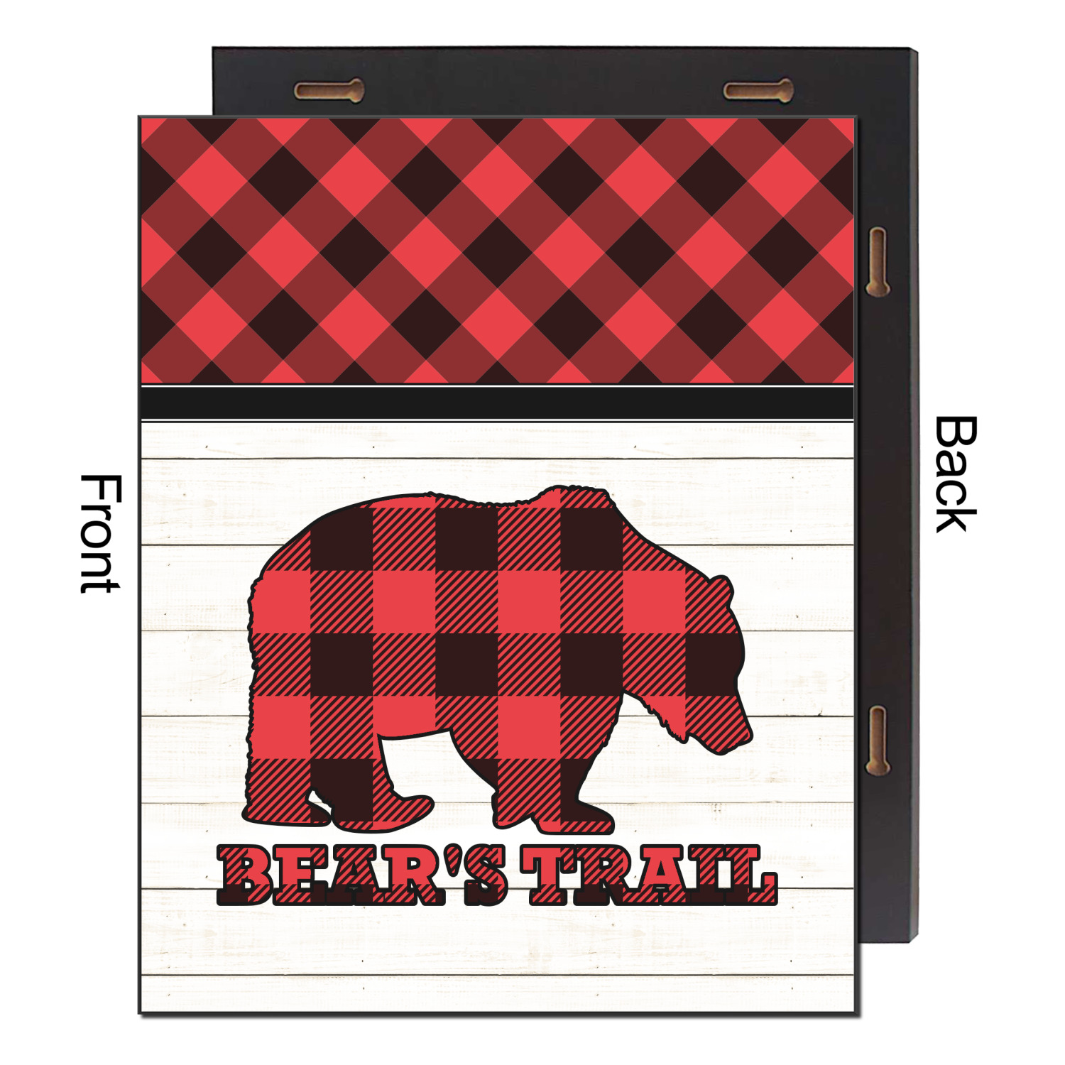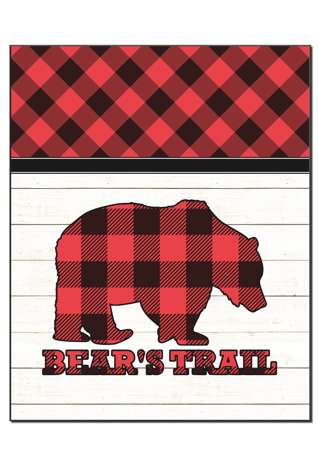The main design is split into two asymmetrical sections. The top section is a diagonal red and black plaid, while the bottom is a light wood texture. On top of the wood texture is where your graphic and personalization go! The bear graphic and text below are filled with another black and red plaid.