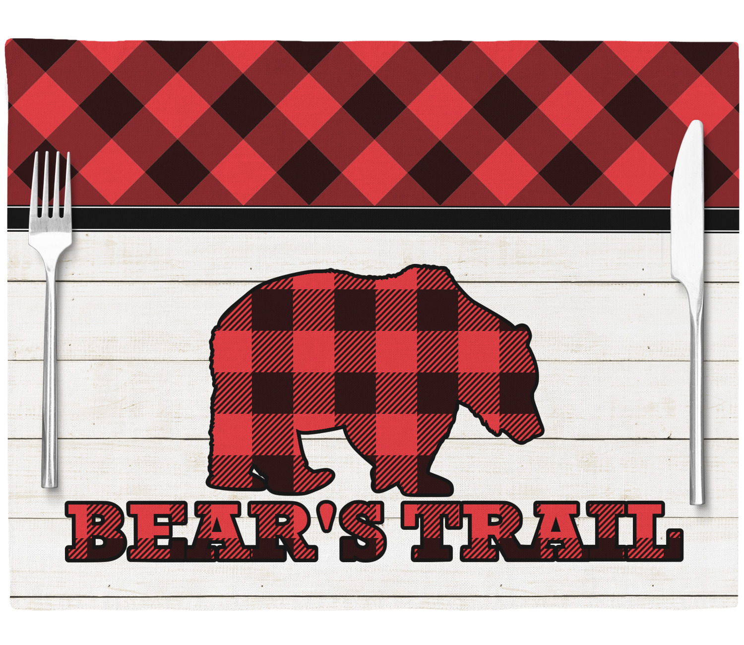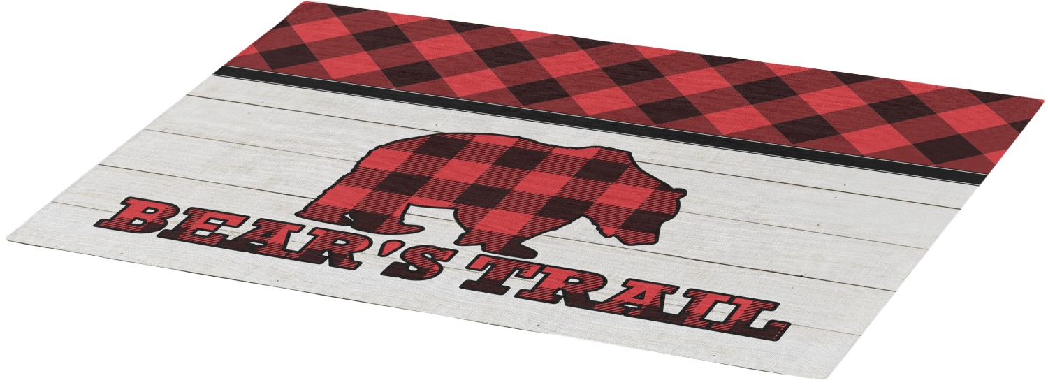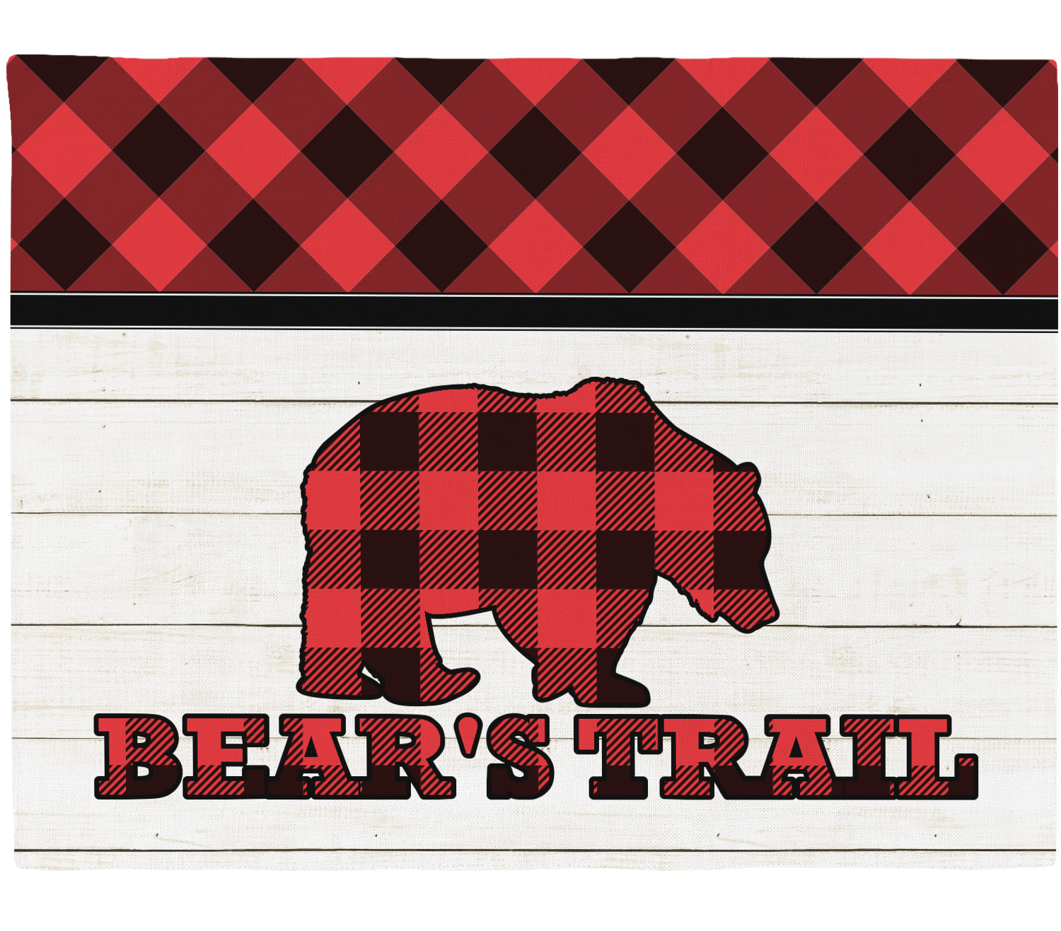 The main design is split into two asymmetrical sections. The top section is a diagonal red and black plaid, while the bottom is a light wood texture. On top of the wood texture is where your graphic and personalization go! The bear graphic and text below are filled with another black and red plaid.