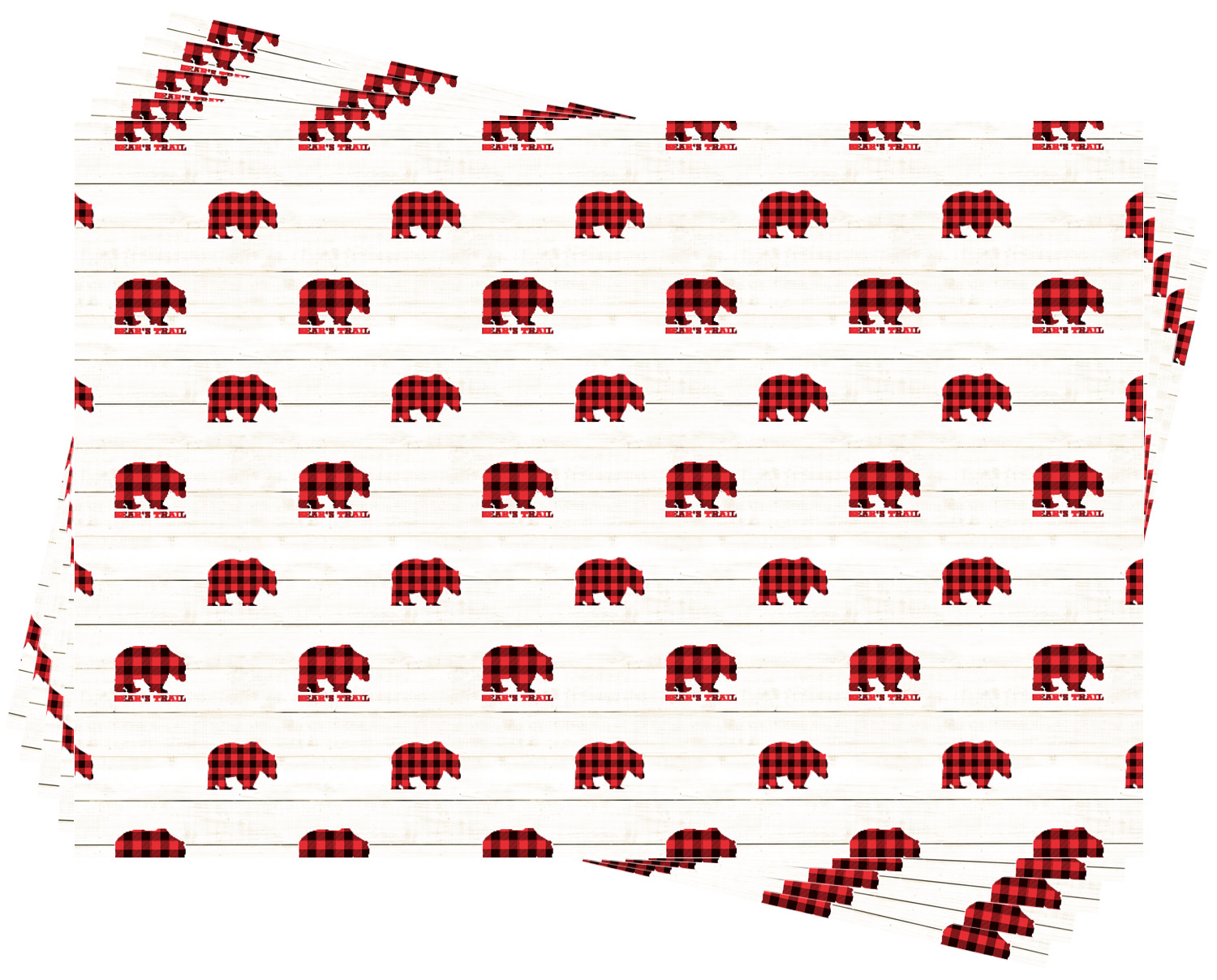 The main design is split into two asymmetrical sections. The top section is a diagonal red and black plaid, while the bottom is a light wood texture. On top of the wood texture is where your graphic and personalization go! The bear graphic and text below are filled with another black and red plaid.
