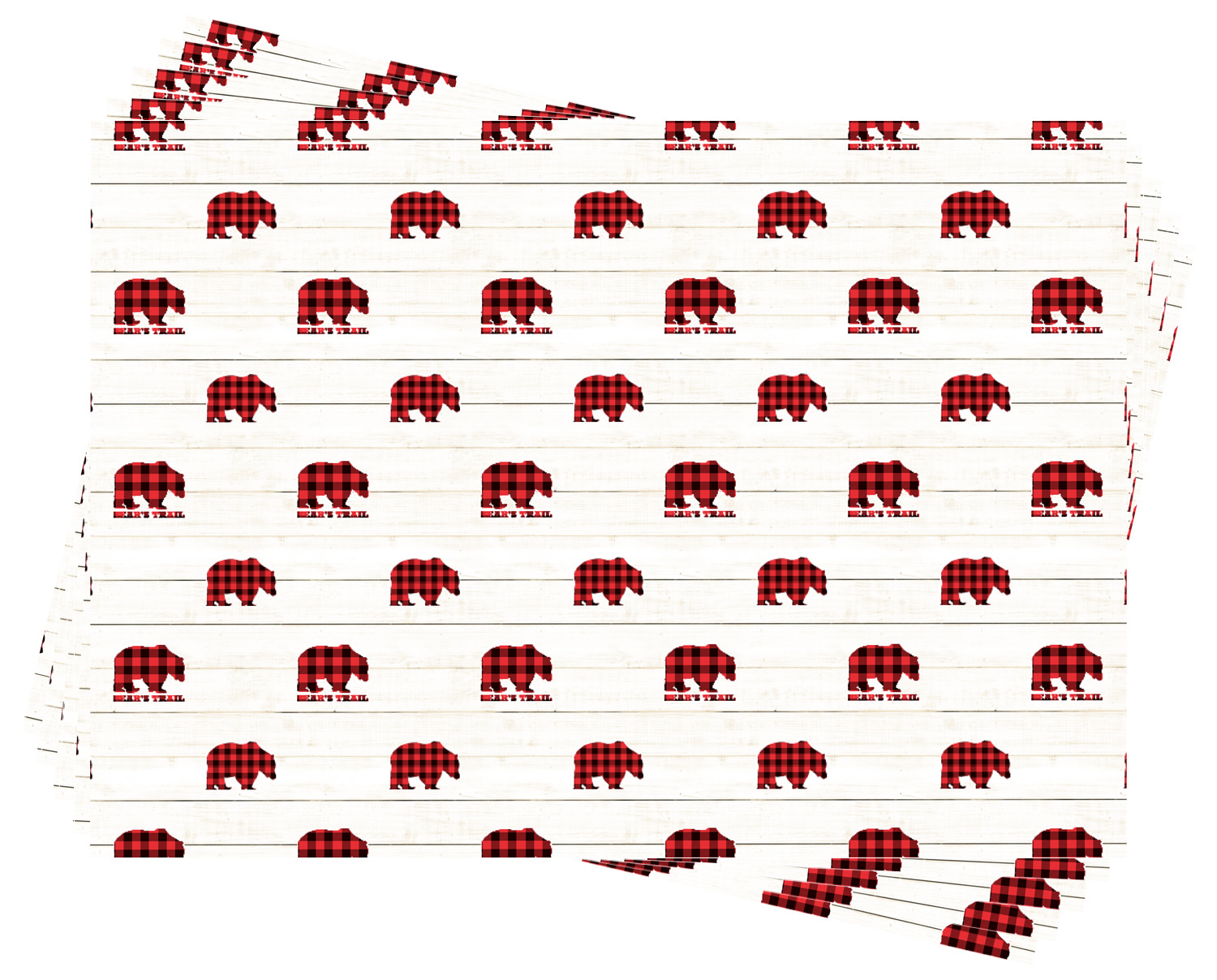 The main design is split into two asymmetrical sections. The top section is a diagonal red and black plaid, while the bottom is a light wood texture. On top of the wood texture is where your graphic and personalization go! The bear graphic and text below are filled with another black and red plaid.