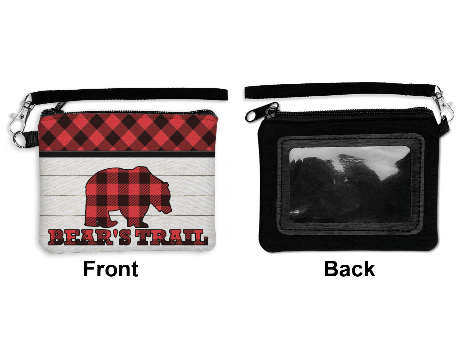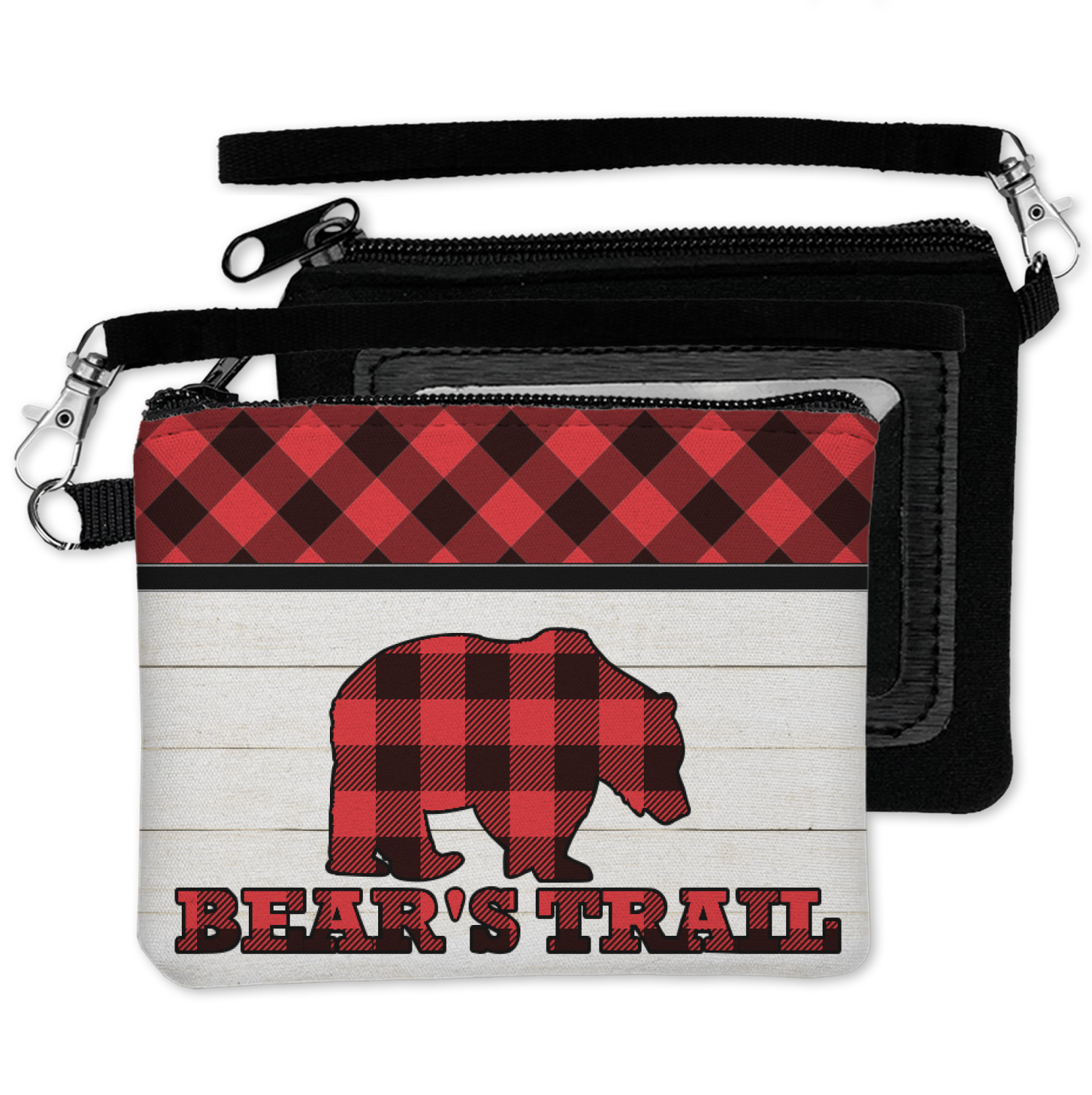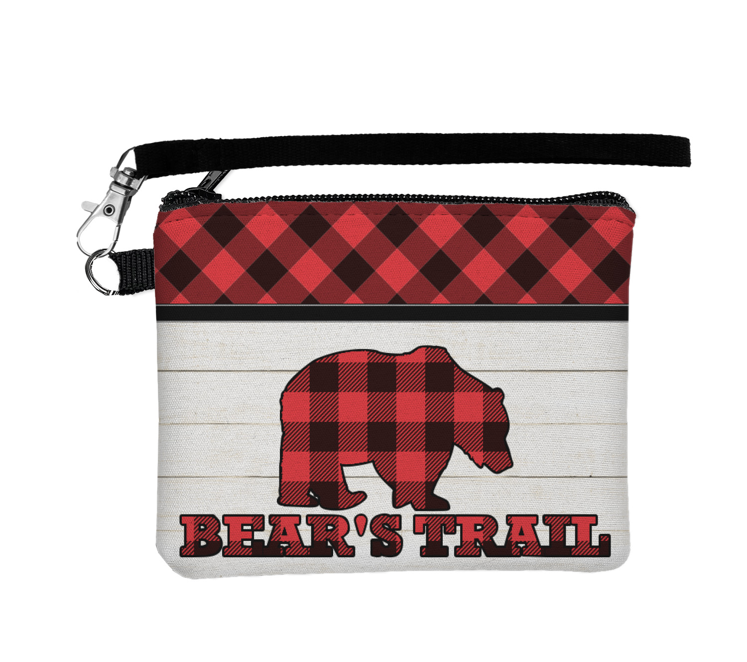 The main design is split into two asymmetrical sections. The top section is a diagonal red and black plaid, while the bottom is a light wood texture. On top of the wood texture is where your graphic and personalization go! The bear graphic and text below are filled with another black and red plaid.