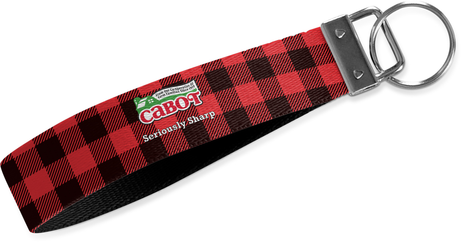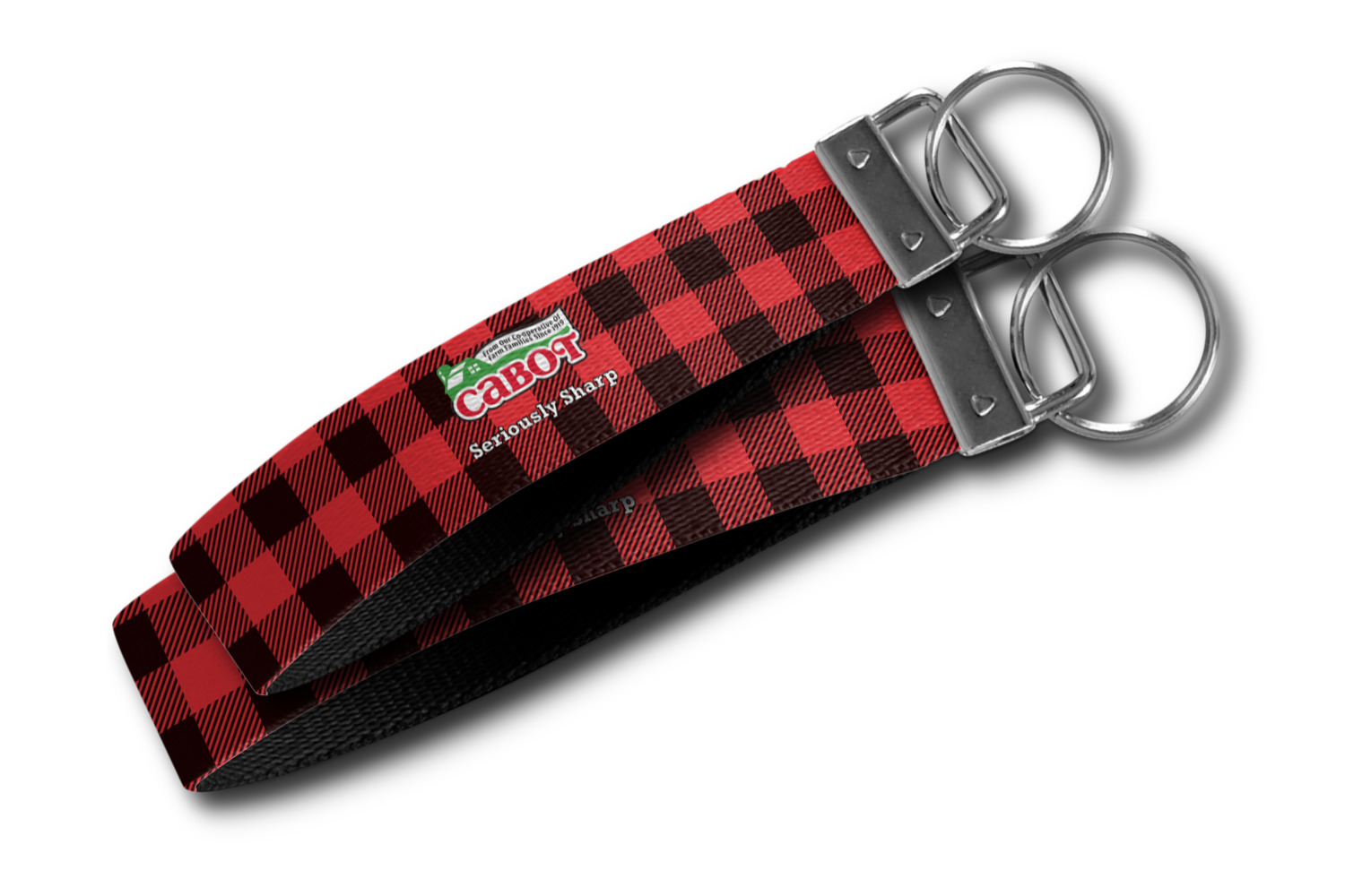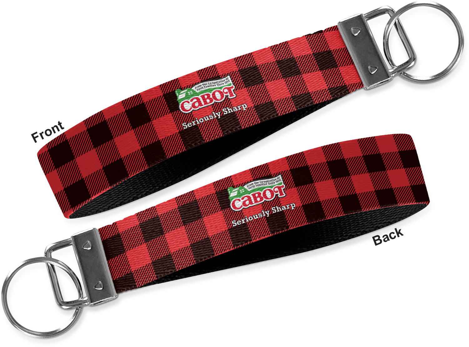 These key fob keychains are made from a polyester weave, right here in the USA. They feature a silver, metal clasp, attached to a round keyring. The piece gives the personalized wristlet a beautiful, finished look. Your customized design is printed on the outside of the keychain strap. We carry these wristlets in two sizes: small, which is 5 inches in width, and large, which is 5.5 inches in width.