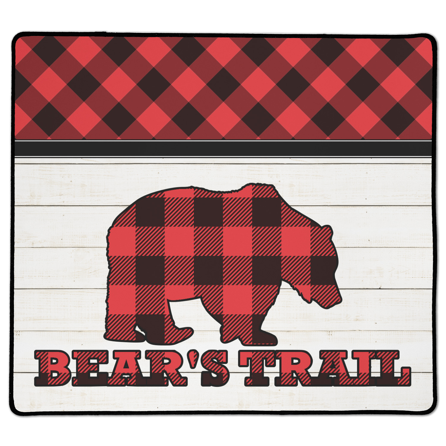 The main design is split into two asymmetrical sections. The top section is a diagonal red and black plaid, while the bottom is a light wood texture. On top of the wood texture is where your graphic and personalization go! The bear graphic and text below are filled with another black and red plaid.