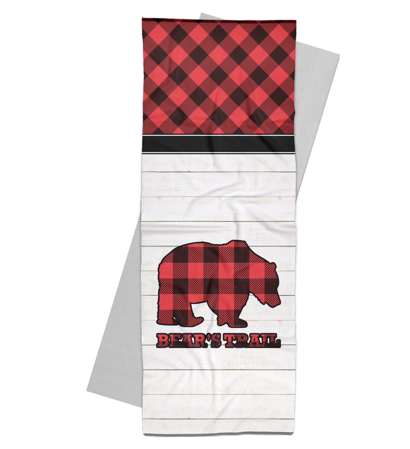 The main design is split into two asymmetrical sections. The top section is a diagonal red and black plaid, while the bottom is a light wood texture. On top of the wood texture is where your graphic and personalization go! The bear graphic and text below are filled with another black and red plaid.