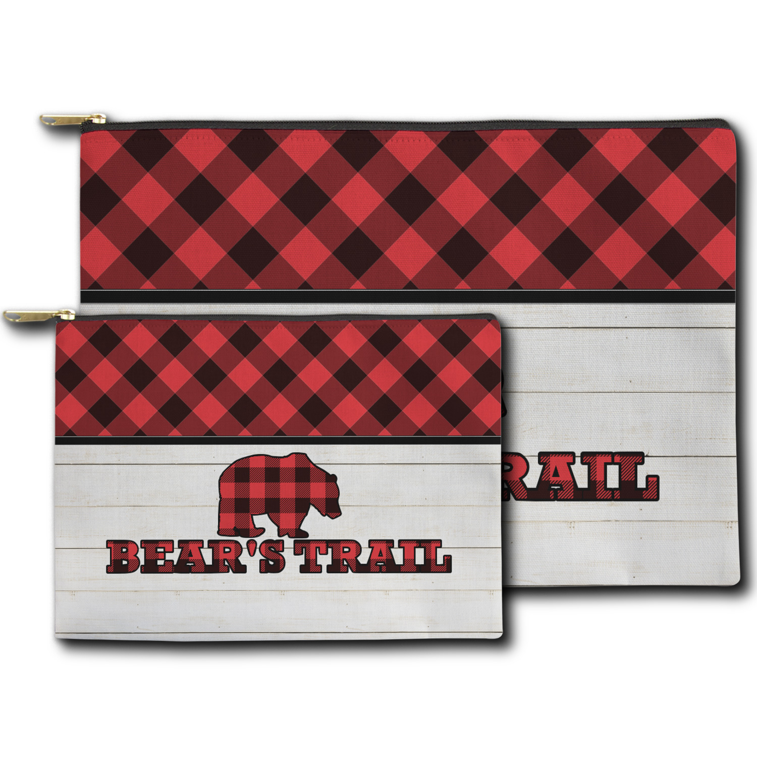 The main design is split into two asymmetrical sections. The top section is a diagonal red and black plaid, while the bottom is a light wood texture. On top of the wood texture is where your graphic and personalization go! The bear graphic and text below are filled with another black and red plaid.