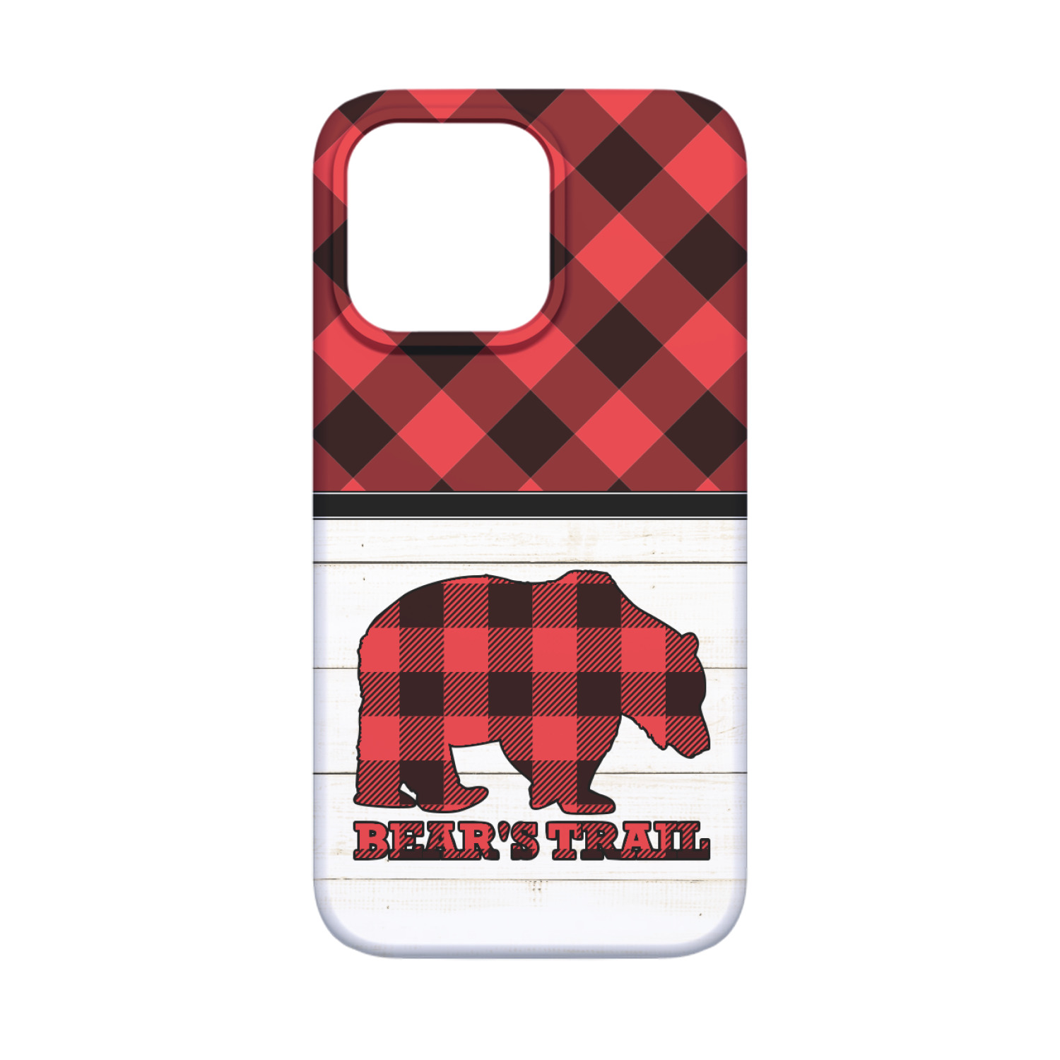 The main design is split into two asymmetrical sections. The top section is a diagonal red and black plaid, while the bottom is a light wood texture. On top of the wood texture is where your graphic and personalization go! The bear graphic and text below are filled with another black and red plaid.