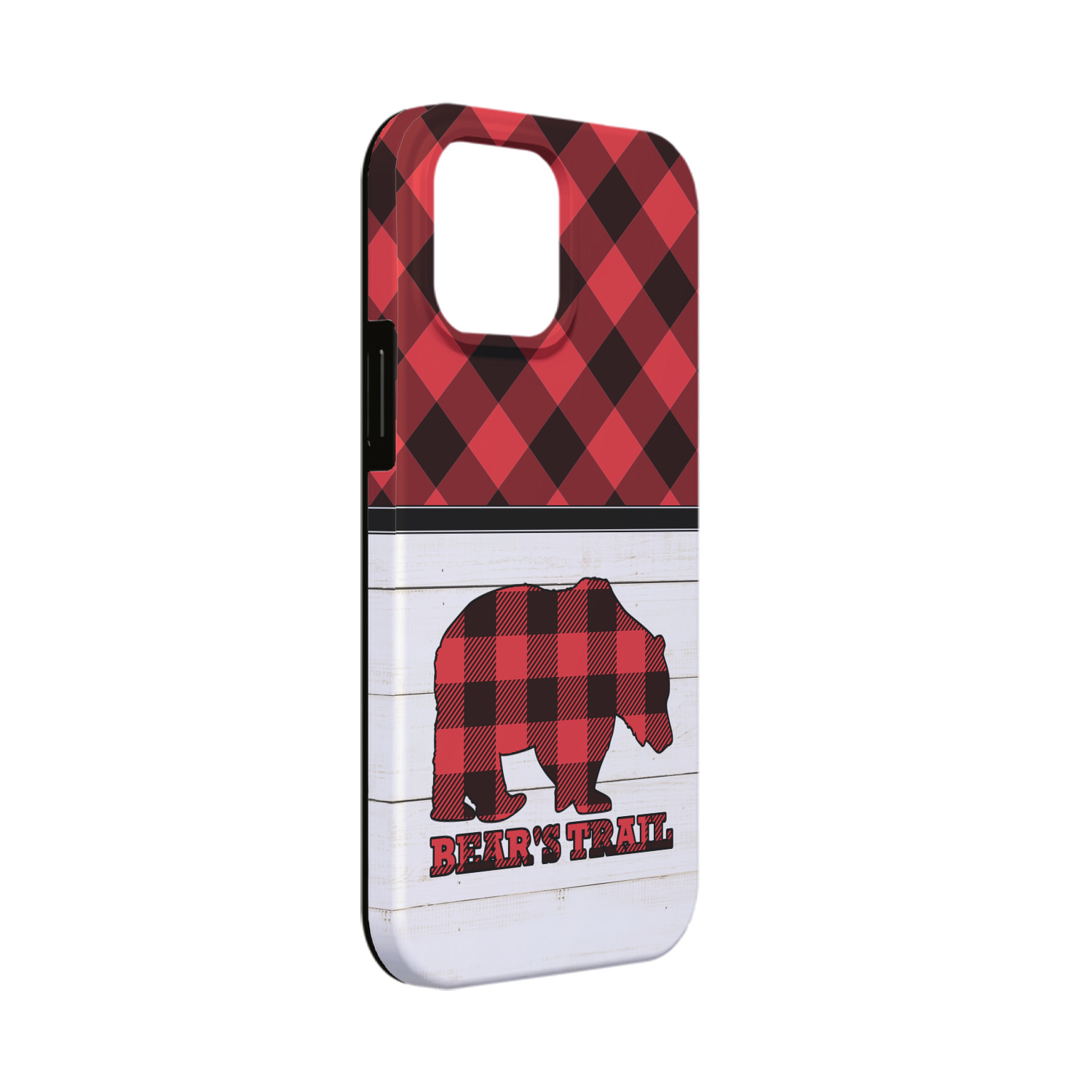 The main design is split into two asymmetrical sections. The top section is a diagonal red and black plaid, while the bottom is a light wood texture. On top of the wood texture is where your graphic and personalization go! The bear graphic and text below are filled with another black and red plaid.