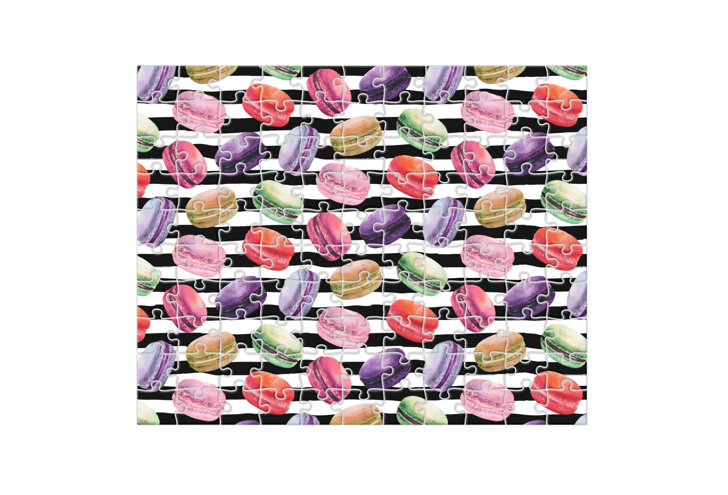 This design simply has the adorable macaron pattern with a striped pattern behind it. You are easily able to add any content you wish to personalize it. The macarons are all different fun colors. You will see green, purple, yellow, red, and pink. The stripes directly behind them are black and white. This design is perfect for any macaron lover or foodie. They will be sure to brighten up your life.