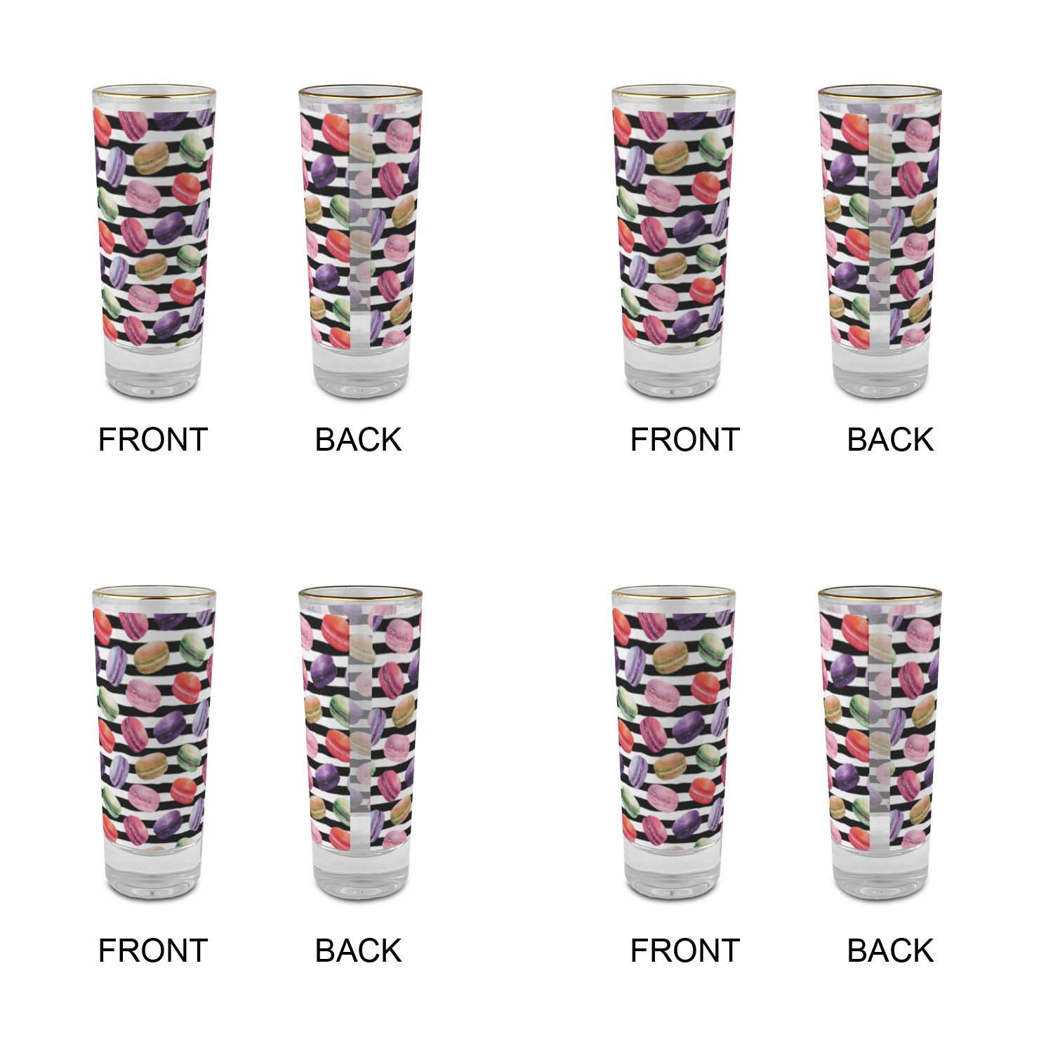 These glass shooter glasses are printed in full color with the design of your choice. These are a tall shooter 2 oz size and stand 4" tall. The print is a full wrap design to boldly display your personalization.