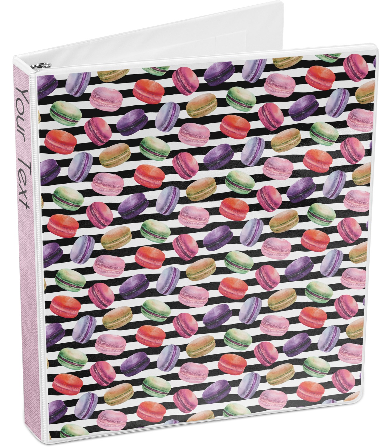 This design simply has the adorable macaron pattern with a striped pattern behind it. You are easily able to add any content you wish to personalize it. The macarons are all different fun colors. You will see green, purple, yellow, red, and pink. The stripes directly behind them are black and white. This design is perfect for any macaron lover or foodie. They will be sure to brighten up your life.