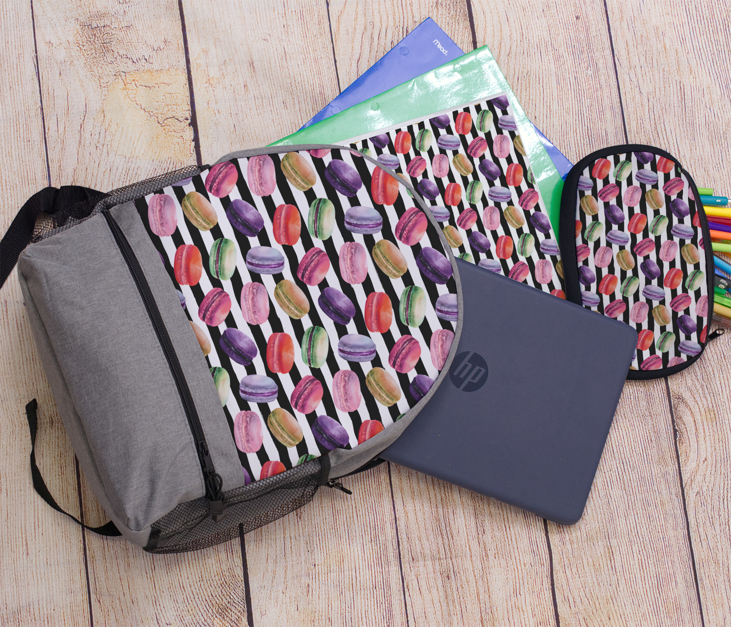 This design simply has the adorable macaron pattern with a striped pattern behind it. You are easily able to add any content you wish to personalize it. The macarons are all different fun colors. You will see green, purple, yellow, red, and pink. The stripes directly behind them are black and white. This design is perfect for any macaron lover or foodie. They will be sure to brighten up your life.