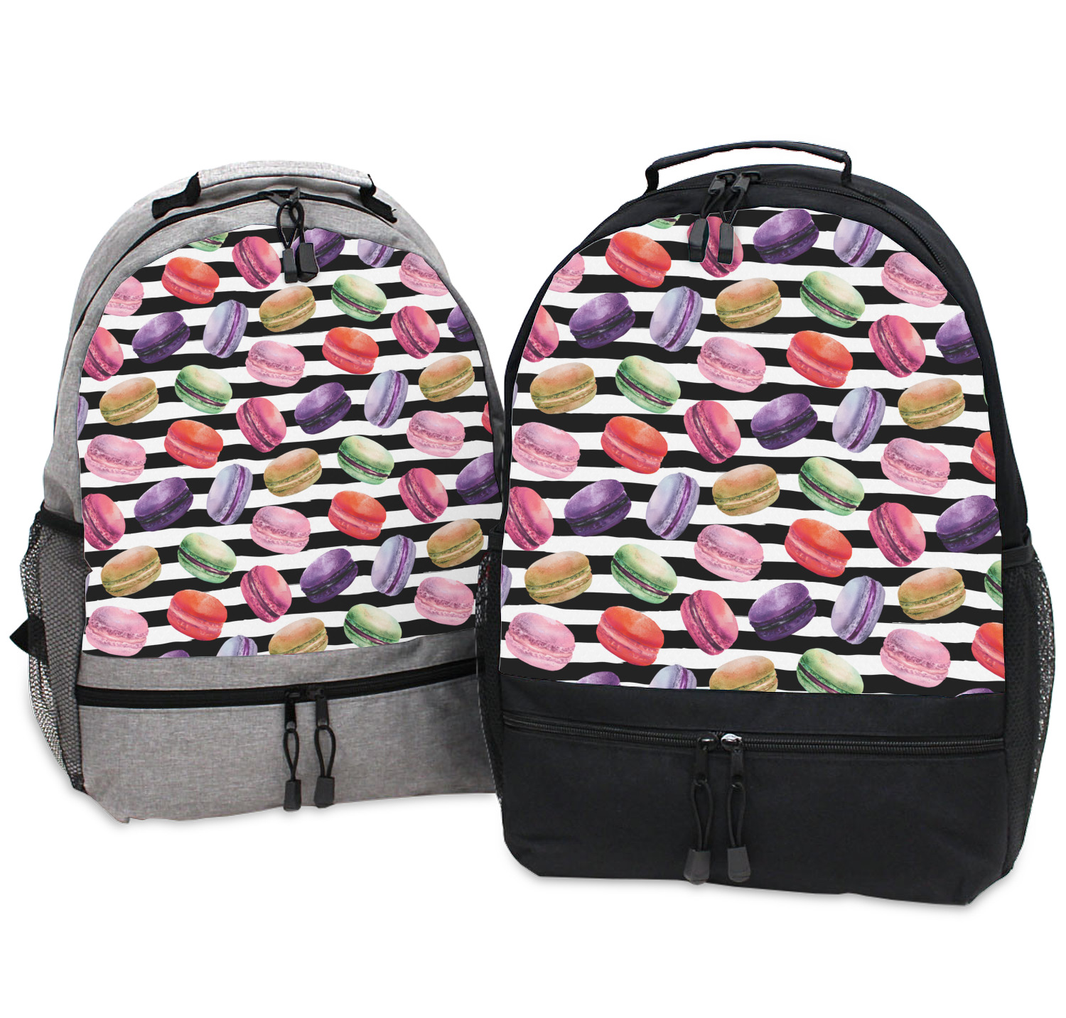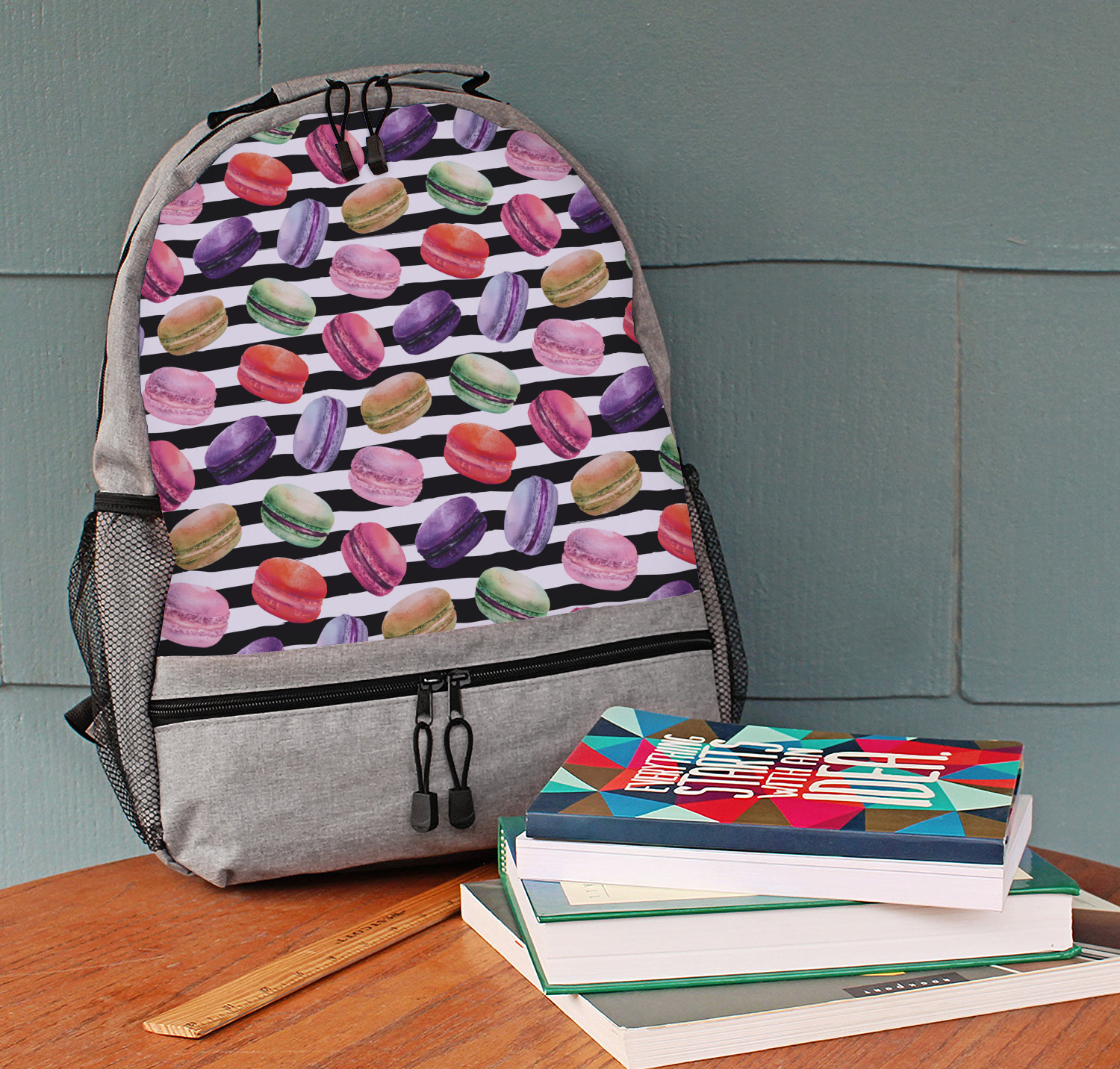 This design simply has the adorable macaron pattern with a striped pattern behind it. You are easily able to add any content you wish to personalize it. The macarons are all different fun colors. You will see green, purple, yellow, red, and pink. The stripes directly behind them are black and white. This design is perfect for any macaron lover or foodie. They will be sure to brighten up your life.