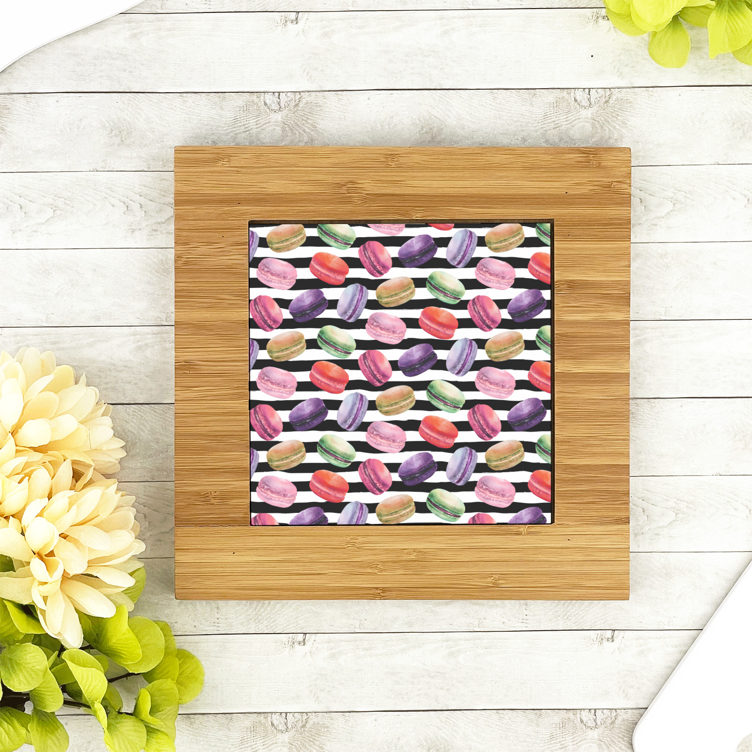 Are you a lover of macarons? Or maybe you're just a foodie in general. These delectable little treasures will look perfect on any kitchenware in your home. Have fun in life with these adorable macarons!