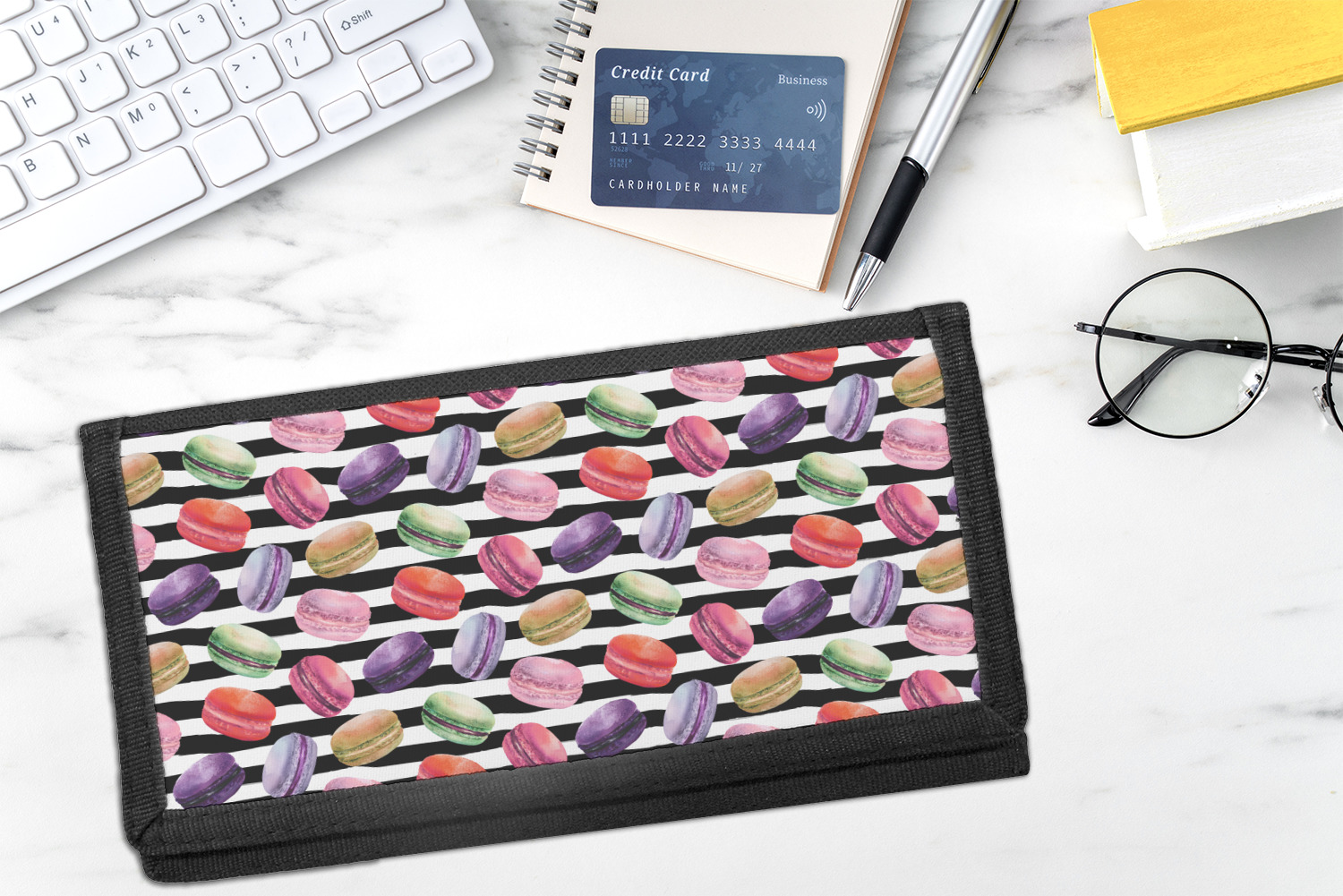 This design simply has the adorable macaron pattern with a striped pattern behind it. You are easily able to add any content you wish to personalize it. The macarons are all different fun colors. You will see green, purple, yellow, red, and pink. The stripes directly behind them are black and white. This design is perfect for any macaron lover or foodie. They will be sure to brighten up your life.