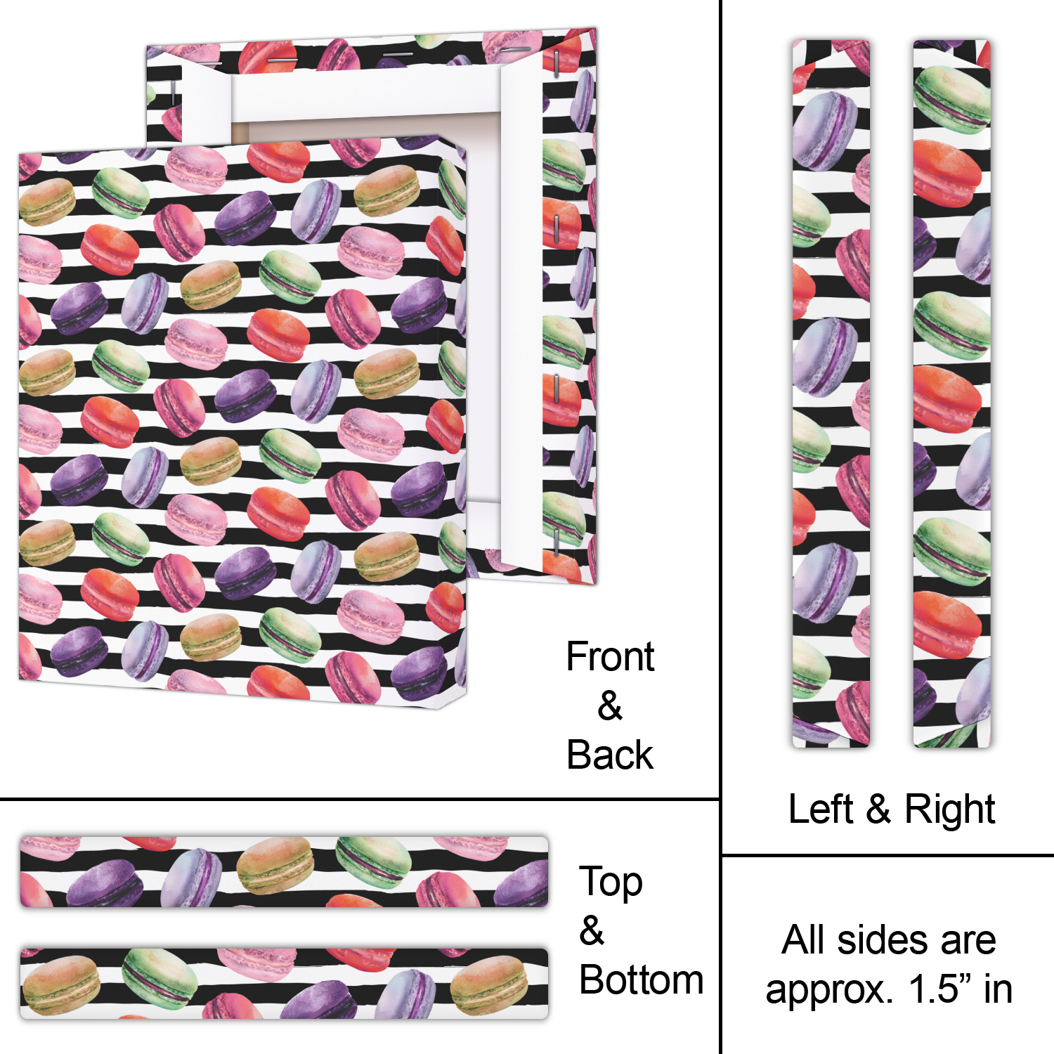 This design simply has the adorable macaron pattern with a striped pattern behind it. You are easily able to add any content you wish to personalize it. The macarons are all different fun colors. You will see green, purple, yellow, red, and pink. The stripes directly behind them are black and white. This design is perfect for any macaron lover or foodie. They will be sure to brighten up your life.