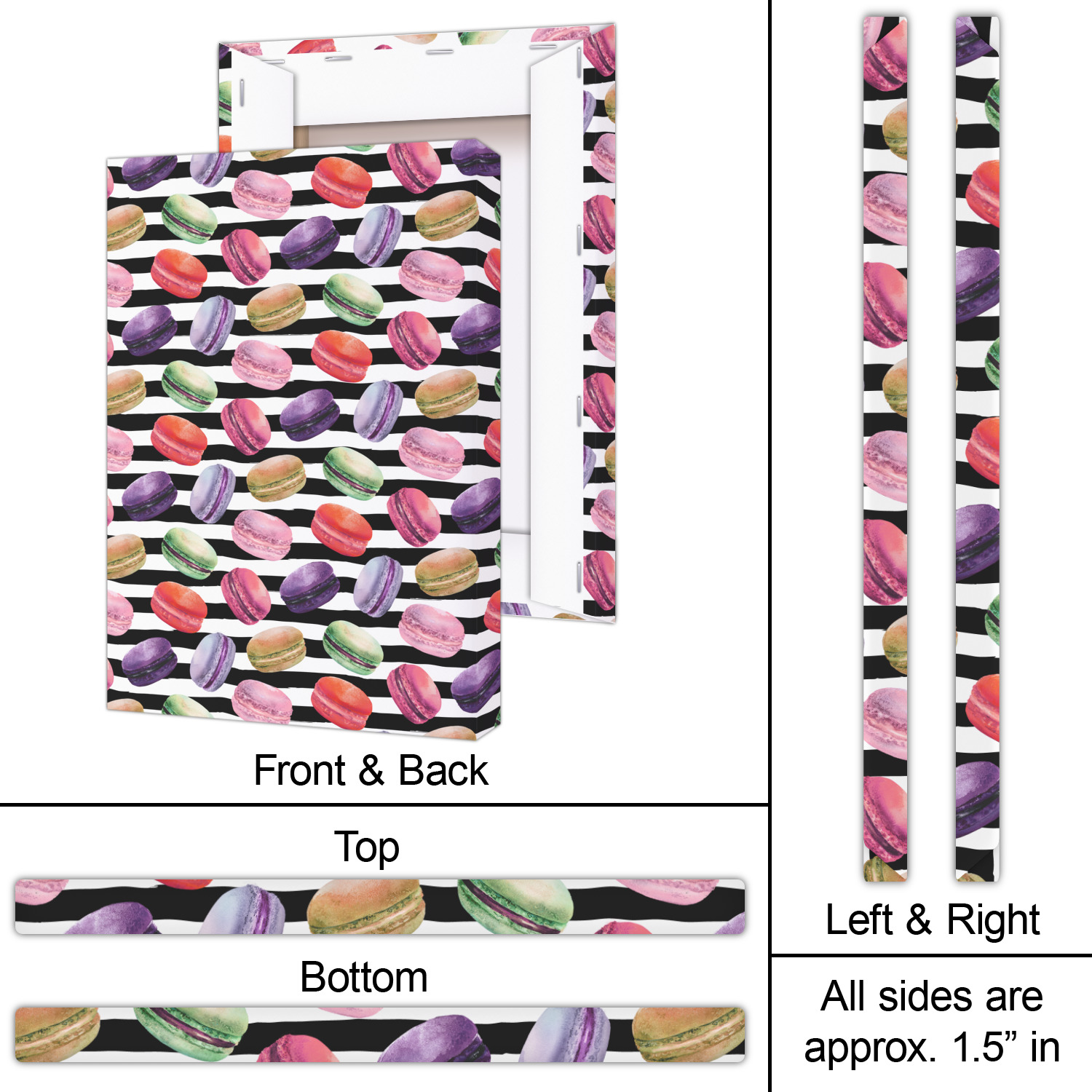 This design simply has the adorable macaron pattern with a striped pattern behind it. You are easily able to add any content you wish to personalize it. The macarons are all different fun colors. You will see green, purple, yellow, red, and pink. The stripes directly behind them are black and white. This design is perfect for any macaron lover or foodie. They will be sure to brighten up your life.