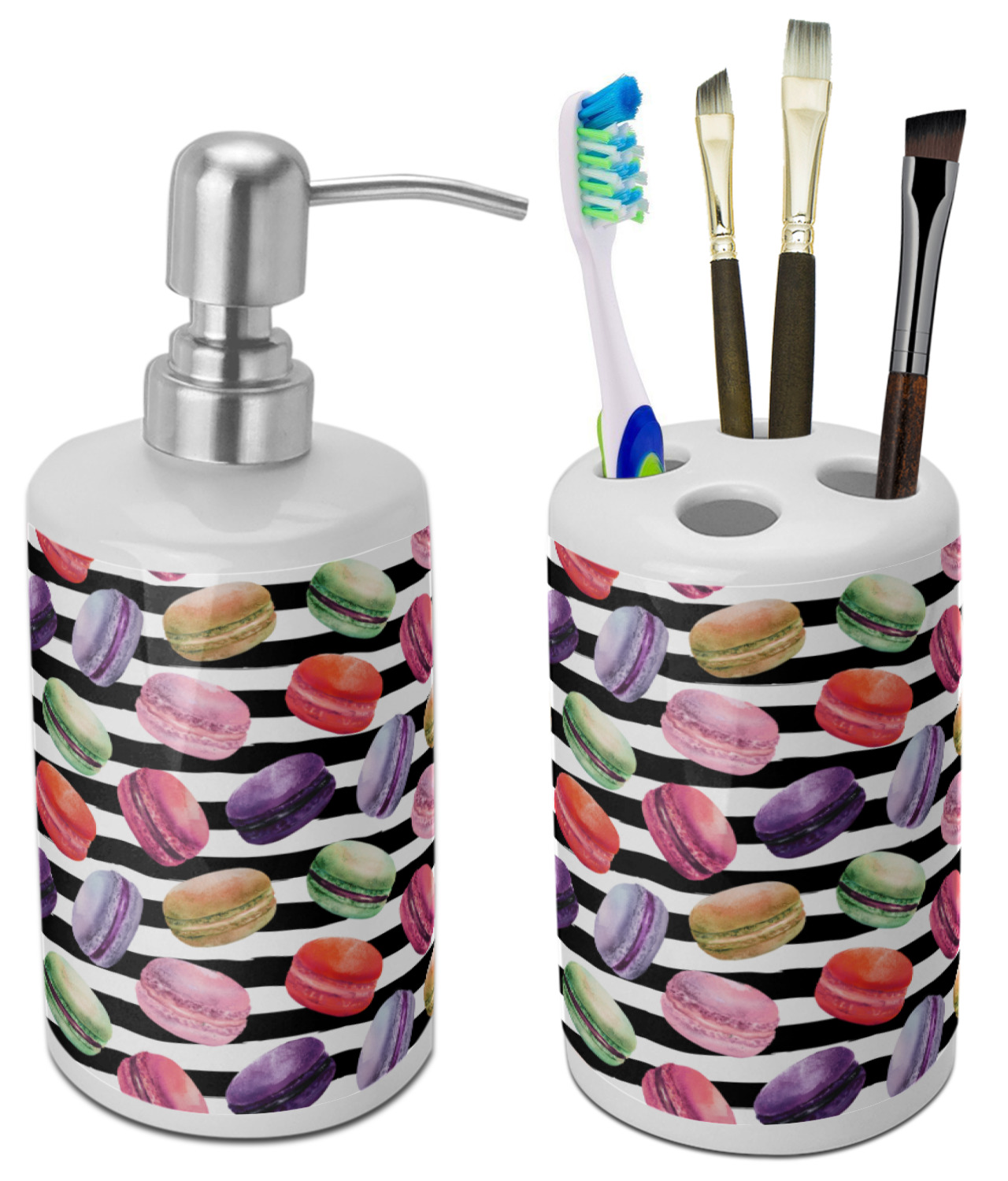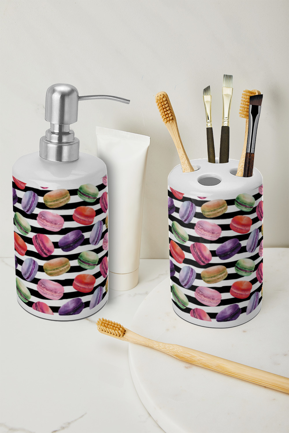 This two piece, ceramic bathroom set will add the perfect splash of color to any bathroom. This set includes one pump dispenser, ideal for soap or lotion, and one toothbrush holder with four holes. Although originally designed for toothbrushes, the holder will also hold make-up brushes, nail files, and other bathroom tools.