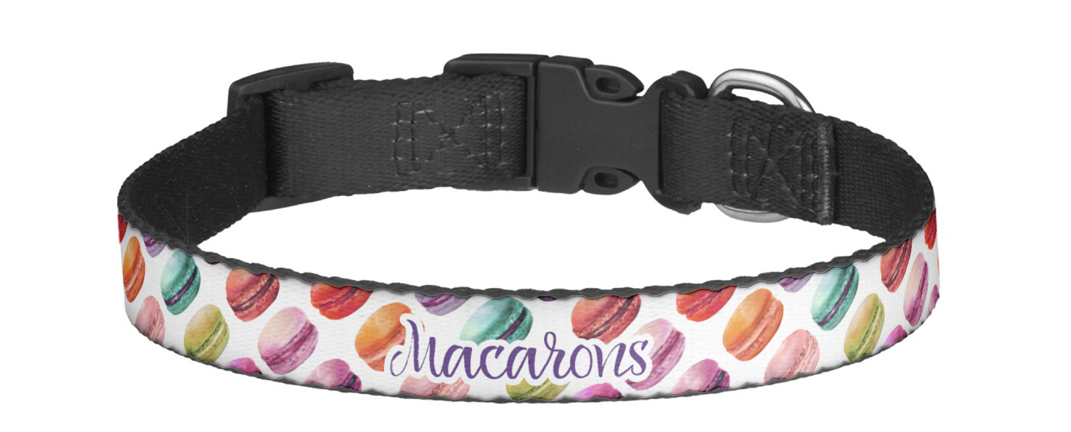 This sturdy collar, made from a durable nylon weave, will outlive your dog's episodes of excited tugging and pulling. Courtesy of its thick plastic buckle and adjuster, this collar is adjustable and accommodating of any dog. Structurally, the collar is a single piece of nylon weave that is sewn together, and features a solid metal loop where you can attach a leash or dog tag. We print and display your dog's name and pattern across the middle of the personalized dog collar.