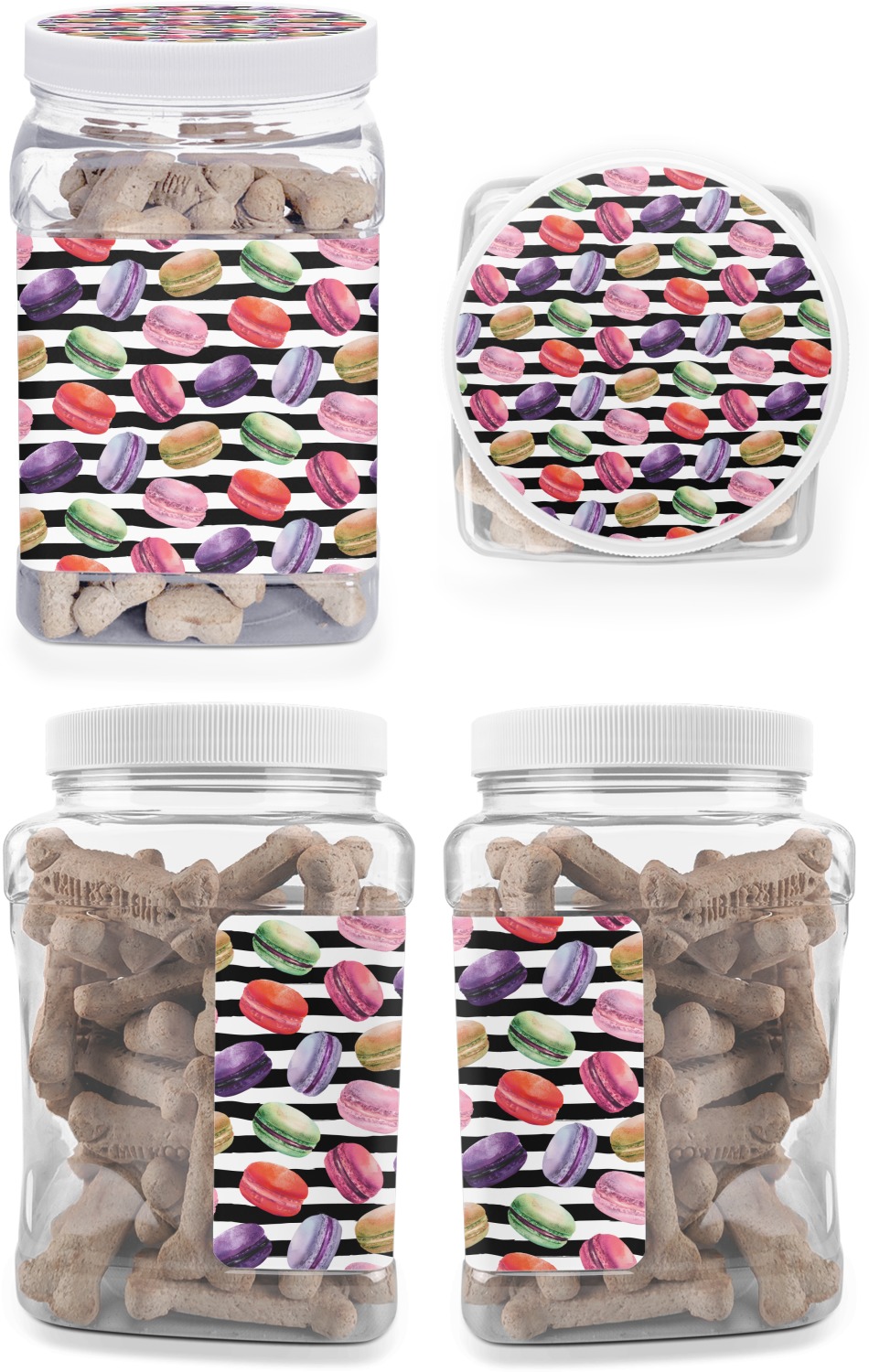 This half gallon jar, made from a sturdy plastic, is the perfect way to keep treats from any naughty pet paws, while still keeping them ready on hand for when your pup performs an impressive trick. This dog cookie jar features a screw-on, white lid that displays your personalized design on a vinyl sticker. We apply another customized sticker that wraps around the front and sides of the jar. Our dog treat jar also has indentations on the rear ends of the sides, which allows for convenient handling, and its square frame allows for easy storage.