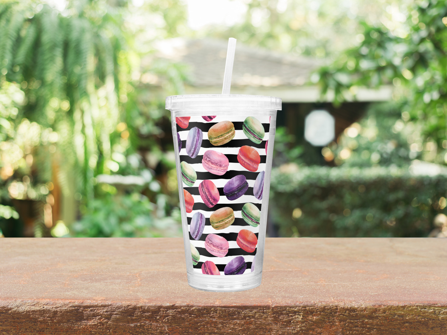 This design simply has the adorable macaron pattern with a striped pattern behind it. You are easily able to add any content you wish to personalize it. The macarons are all different fun colors. You will see green, purple, yellow, red, and pink. The stripes directly behind them are black and white. This design is perfect for any macaron lover or foodie. They will be sure to brighten up your life.