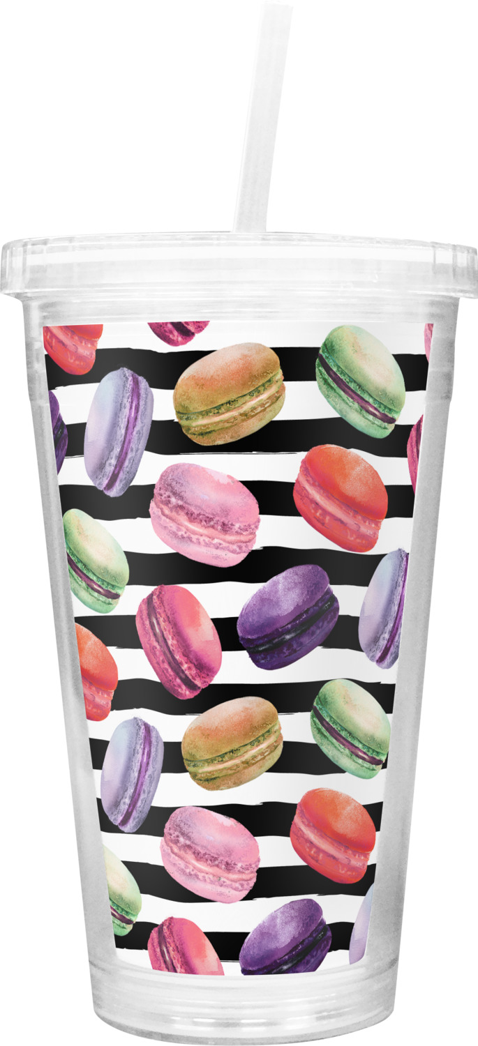 These BPA free tumblers with their double walls keep your drink cold and will not sweat on the outside; they have a clear acrylic top and a reusable straw with a ring around the bottom to keep the straw from falling out.