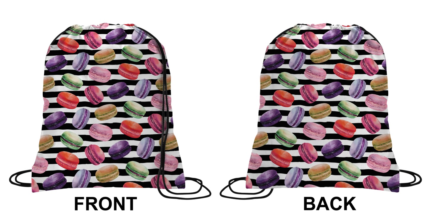 Your custom design will appear on the front and the back of the backpack. You can customize each side individually. The inside of the backpack is white and the drawstrings are black. The back pack is made of 100% polyester fabric.