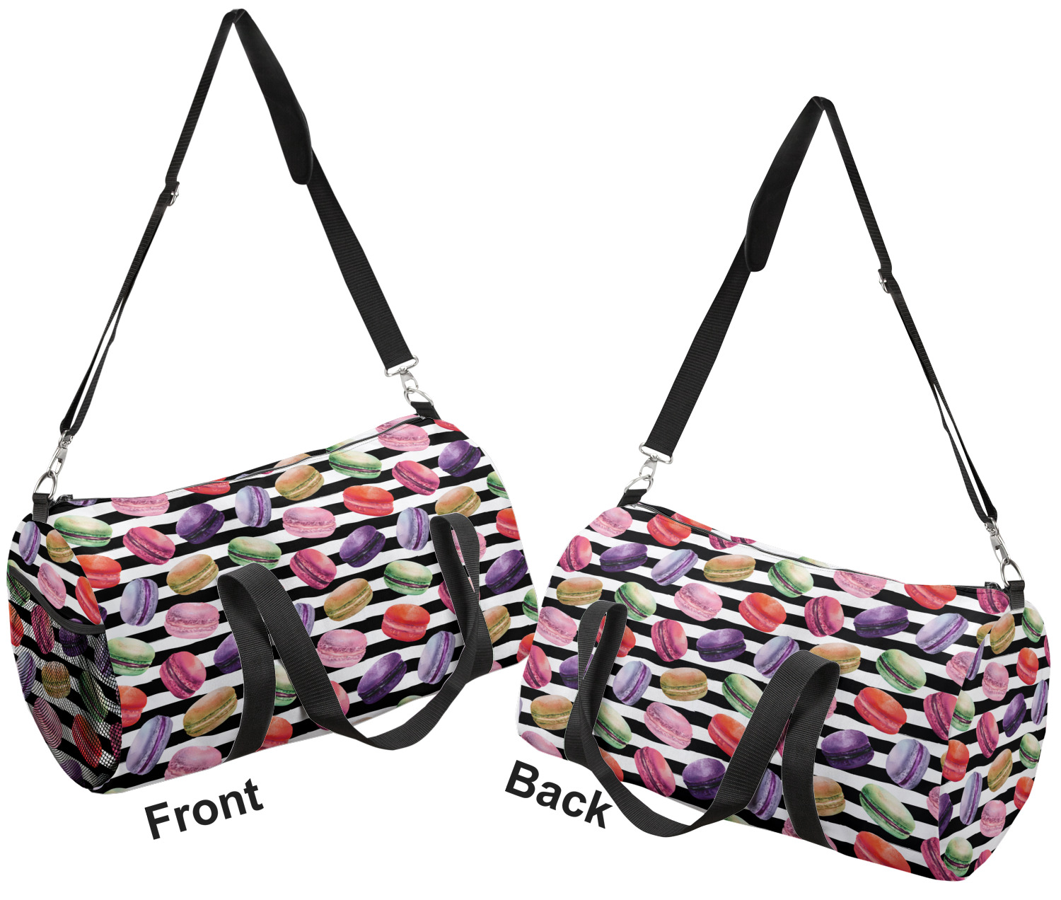 This duffle is a sturdy bag made of a canvas material. It comes in two sizes: Small (19"W x 9.5"H x 9.5"D) and Large (23"W x 12"H x 12"D). The bag is a cylindrical shape with a black adjustable strap and two handles. On one side is an elastic pouch to put a waterbottle or other small item. Your product will be sublimated with your design and is able to be designed on the front, back, and sides. Be sure to remember that the straps may cut into parts of your design if you upload your own artwork.