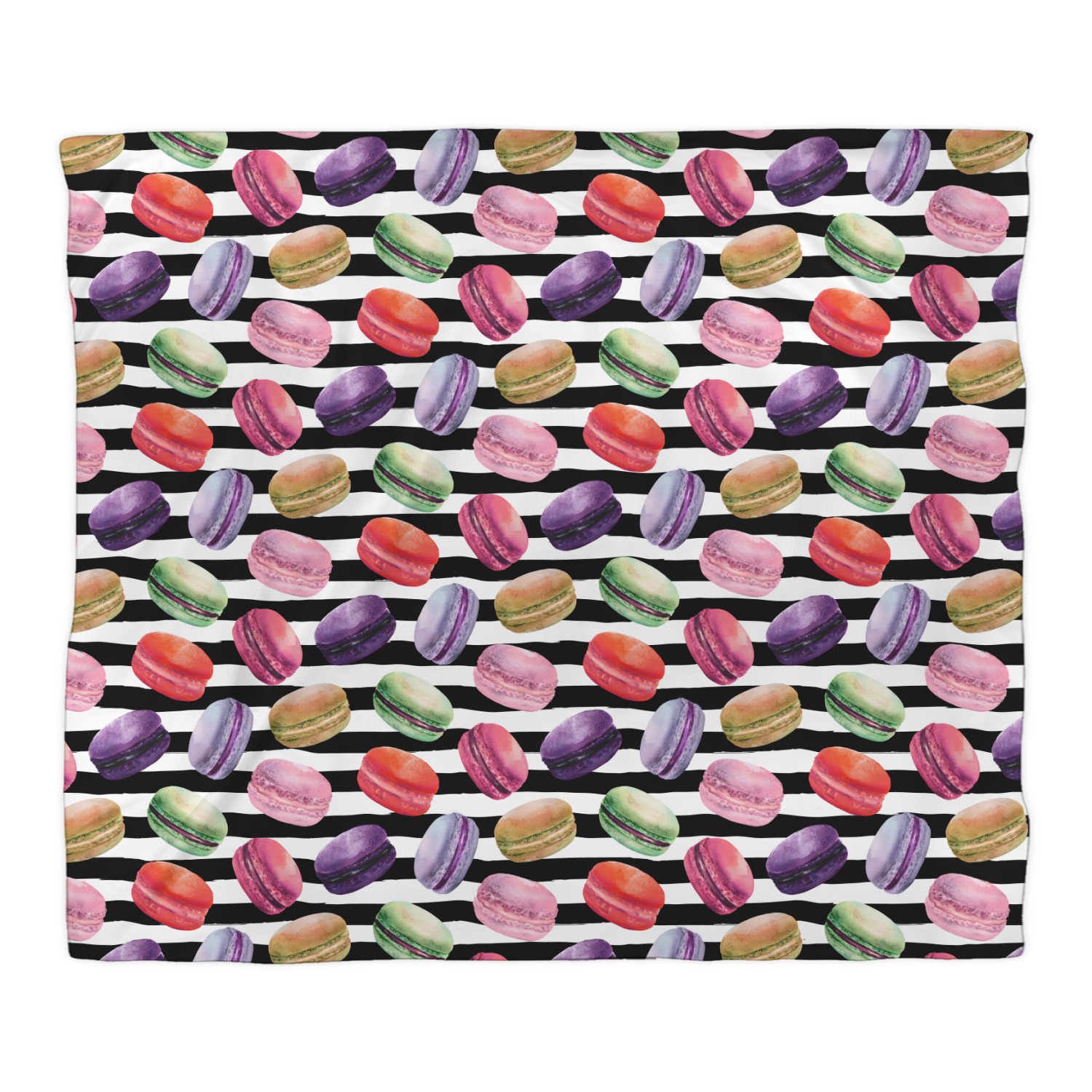 This design simply has the adorable macaron pattern with a striped pattern behind it. You are easily able to add any content you wish to personalize it. The macarons are all different fun colors. You will see green, purple, yellow, red, and pink. The stripes directly behind them are black and white. This design is perfect for any macaron lover or foodie. They will be sure to brighten up your life.