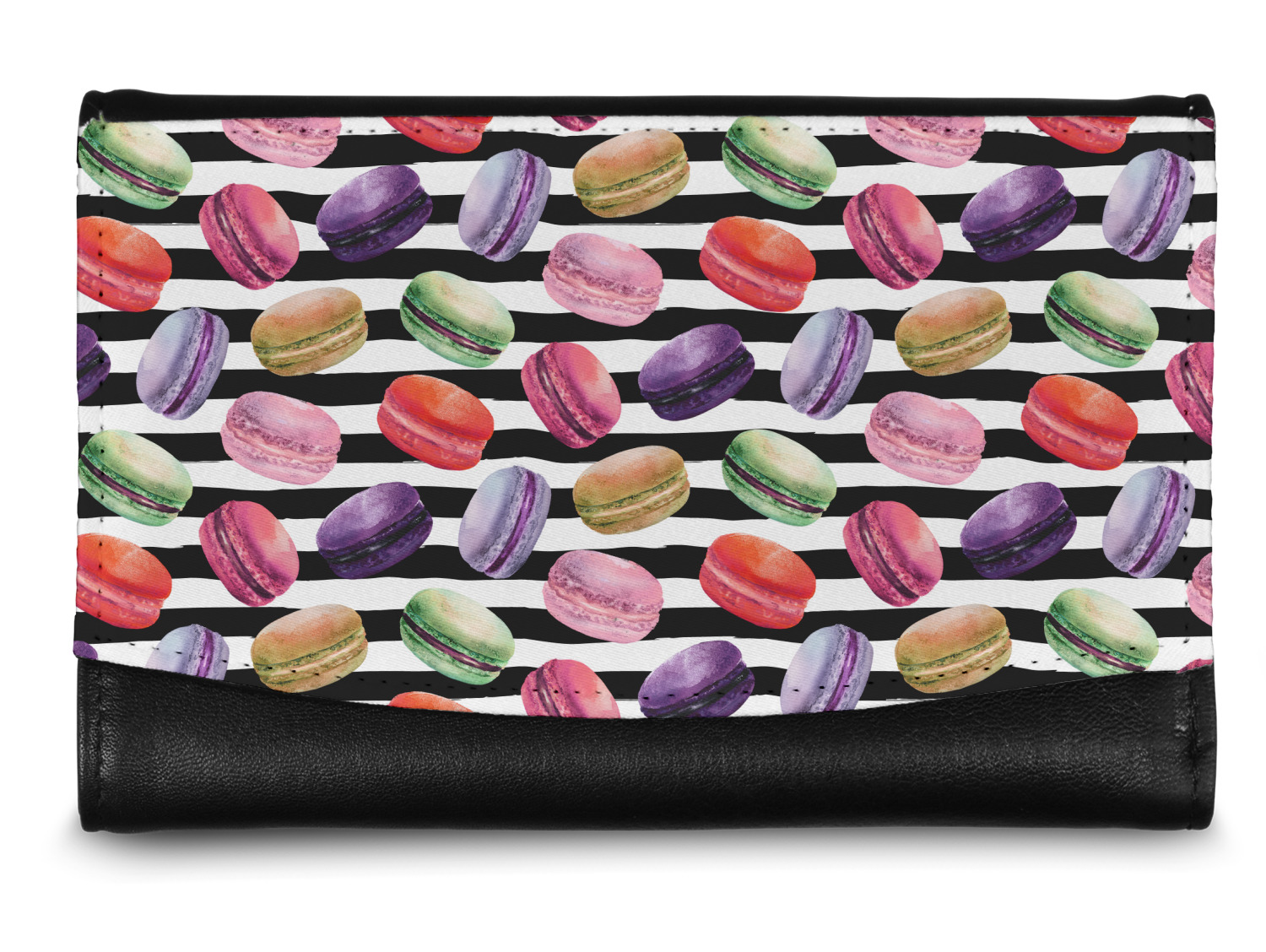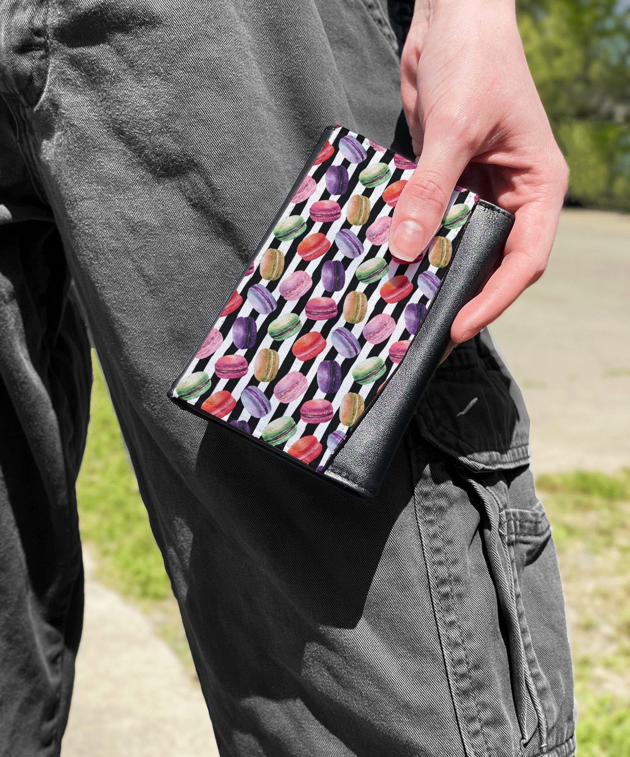This design simply has the adorable macaron pattern with a striped pattern behind it. You are easily able to add any content you wish to personalize it. The macarons are all different fun colors. You will see green, purple, yellow, red, and pink. The stripes directly behind them are black and white. This design is perfect for any macaron lover or foodie. They will be sure to brighten up your life.