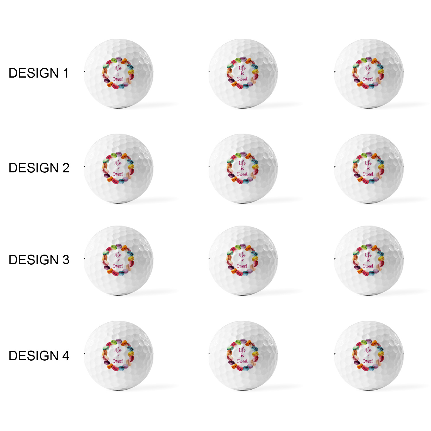 Printed in a 7/8" circle on each ball, you can customize these with our design studio or use your own designs. For a set of 3 you can design each one individually, for a set of 12 you will be able to use 4 unique designs and will receive 3 balls with each design.
