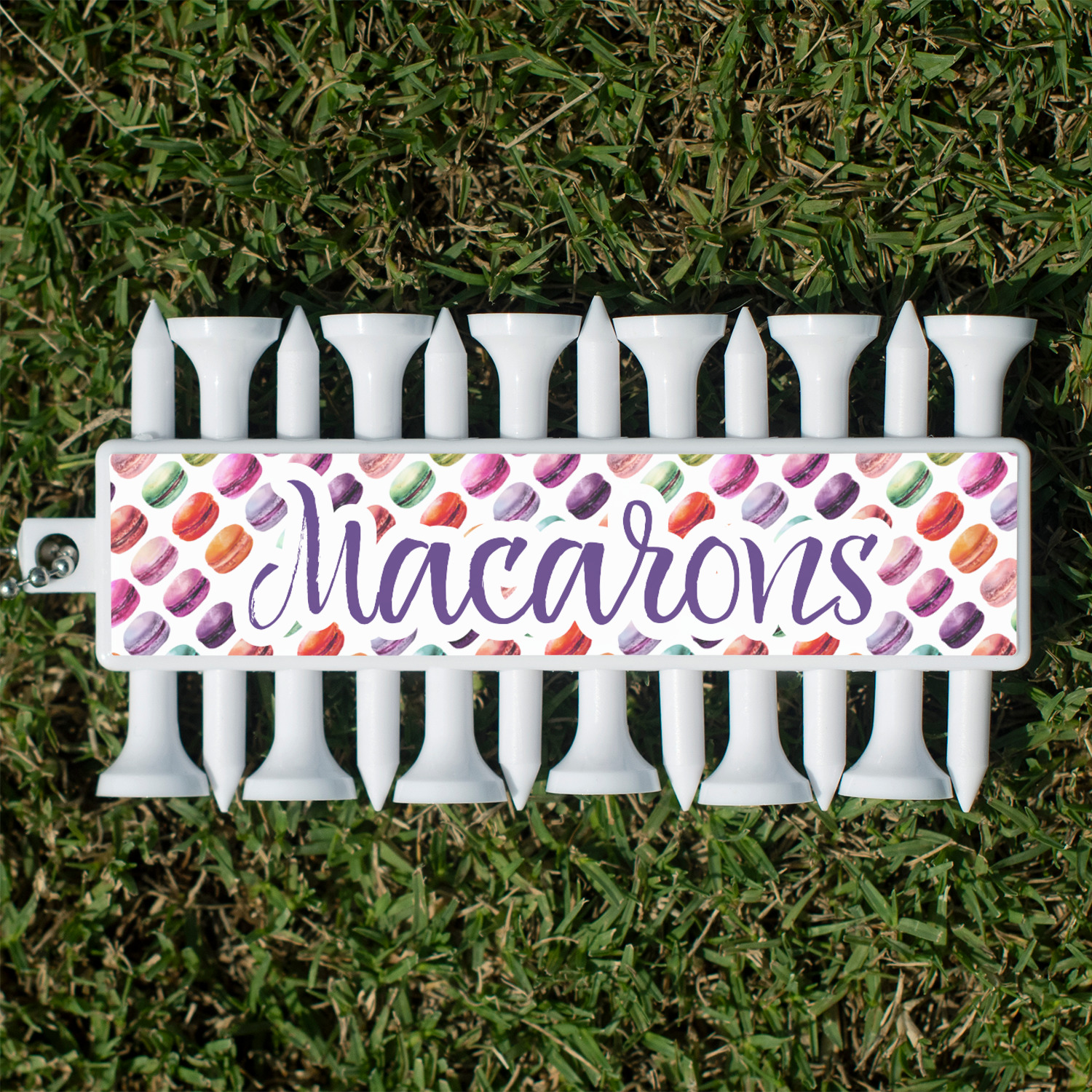 With 12 tees on a lightweight, portable key chain, it almost ensures a great 18 holes. Our tees are made of white plastic and are a little over 2". Design the front and the back of the golf tee holder. Pick from over a hundred designs, colors, and personalization styles! The set even comes with three removable ball markers as well!