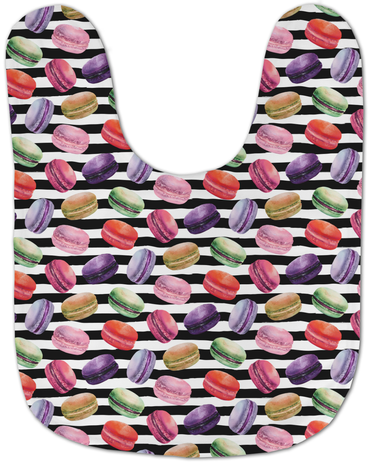 This design simply has the adorable macaron pattern with a striped pattern behind it. You are easily able to add any content you wish to personalize it. The macarons are all different fun colors. You will see green, purple, yellow, red, and pink. The stripes directly behind them are black and white. This design is perfect for any macaron lover or foodie. They will be sure to brighten up your life.