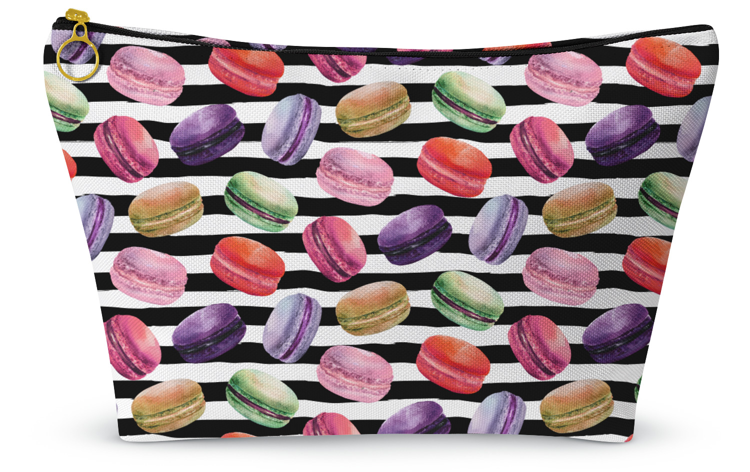 This design simply has the adorable macaron pattern with a striped pattern behind it. You are easily able to add any content you wish to personalize it. The macarons are all different fun colors. You will see green, purple, yellow, red, and pink. The stripes directly behind them are black and white. This design is perfect for any macaron lover or foodie. They will be sure to brighten up your life.