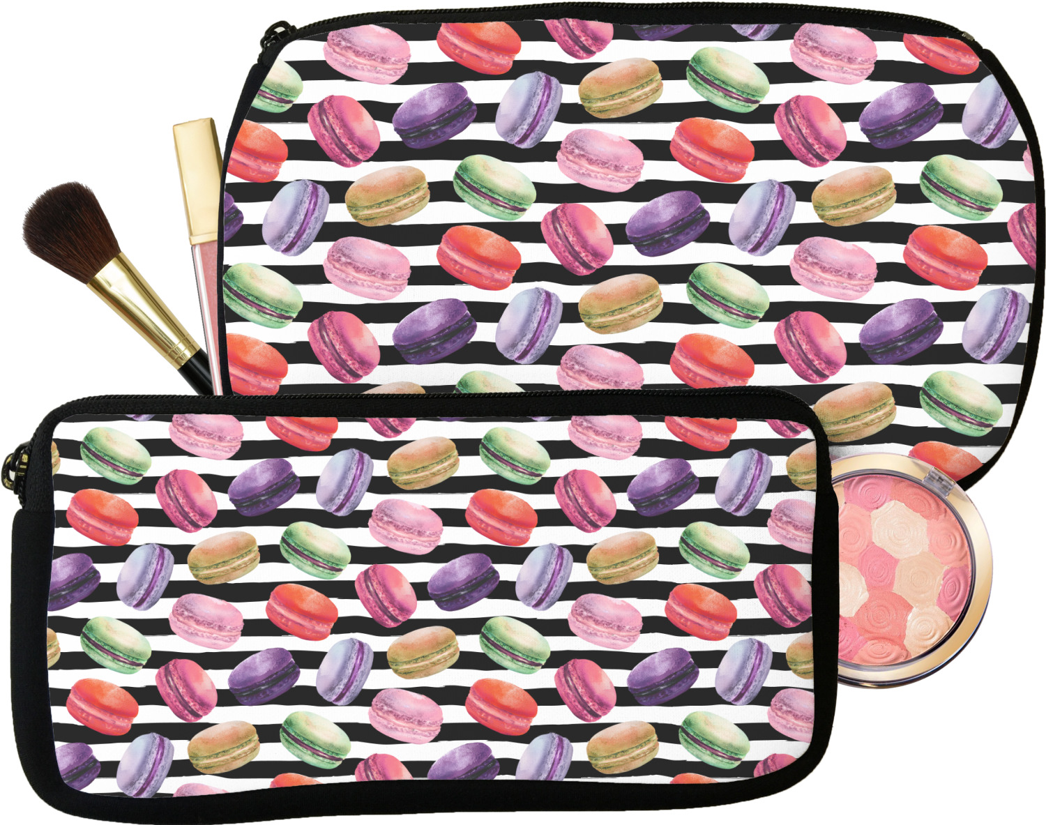 Our makeup bags are available in 2 sizes, small for smaller purses and less makeup, while the medium one for larger purses, as well as more makeup. Neither one of these is big enough for me when I am traveling - so, we do carry custom toiletry bags for travel.