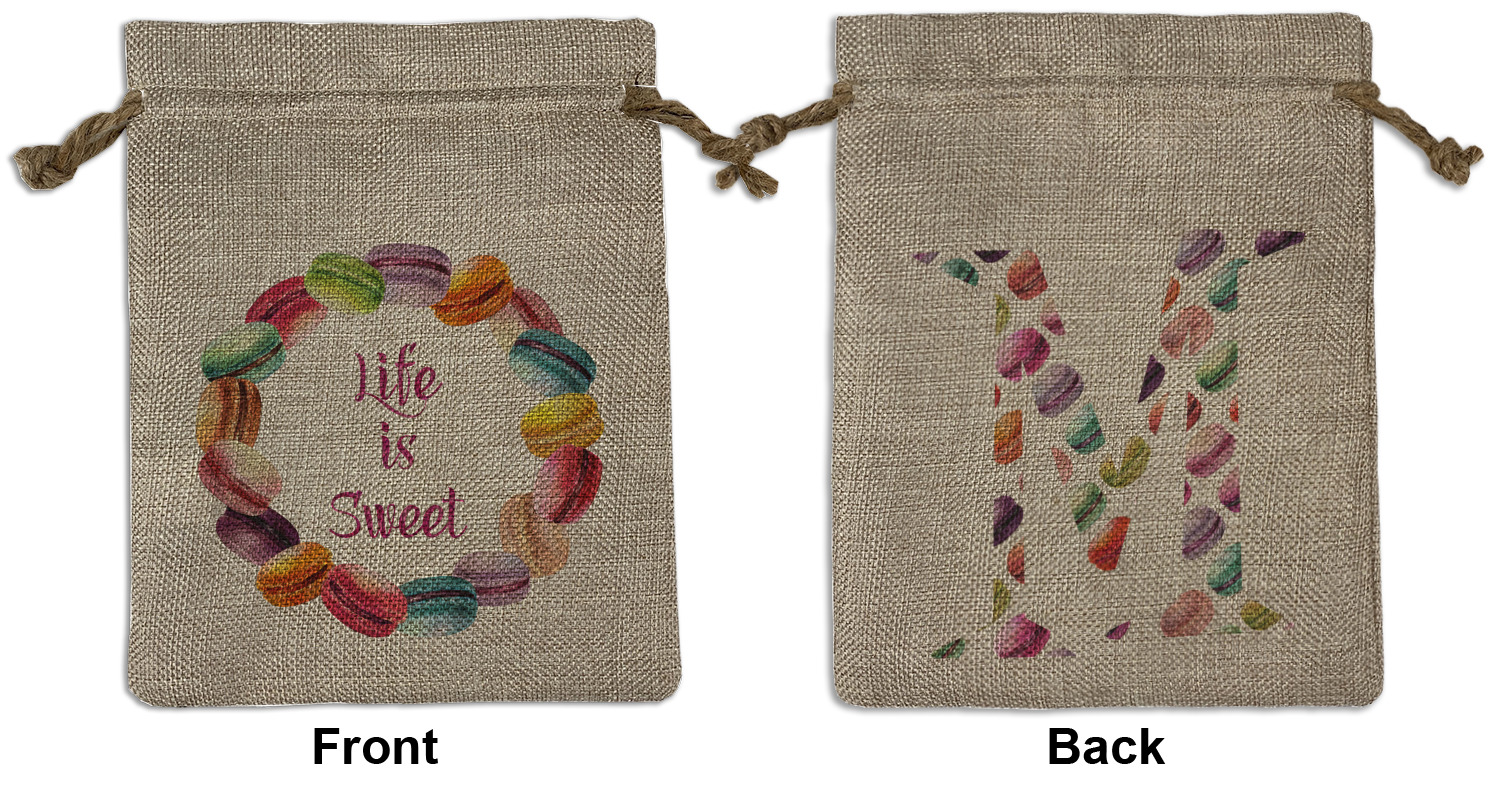 We sell our Burlap Gift Bags in 3 variant sized bags. Made with burlap polyester, each personalized bag can be secured with a twine drawstring pull. Your custom design is available to print on one side or both sides - completely up to you! The sizes of the bags measure approximately 4.5" x 6.5" for the smallest size, 6.5" x 8.0" for the medium size, and 6.5" x 13.5" for the large-sized bag.