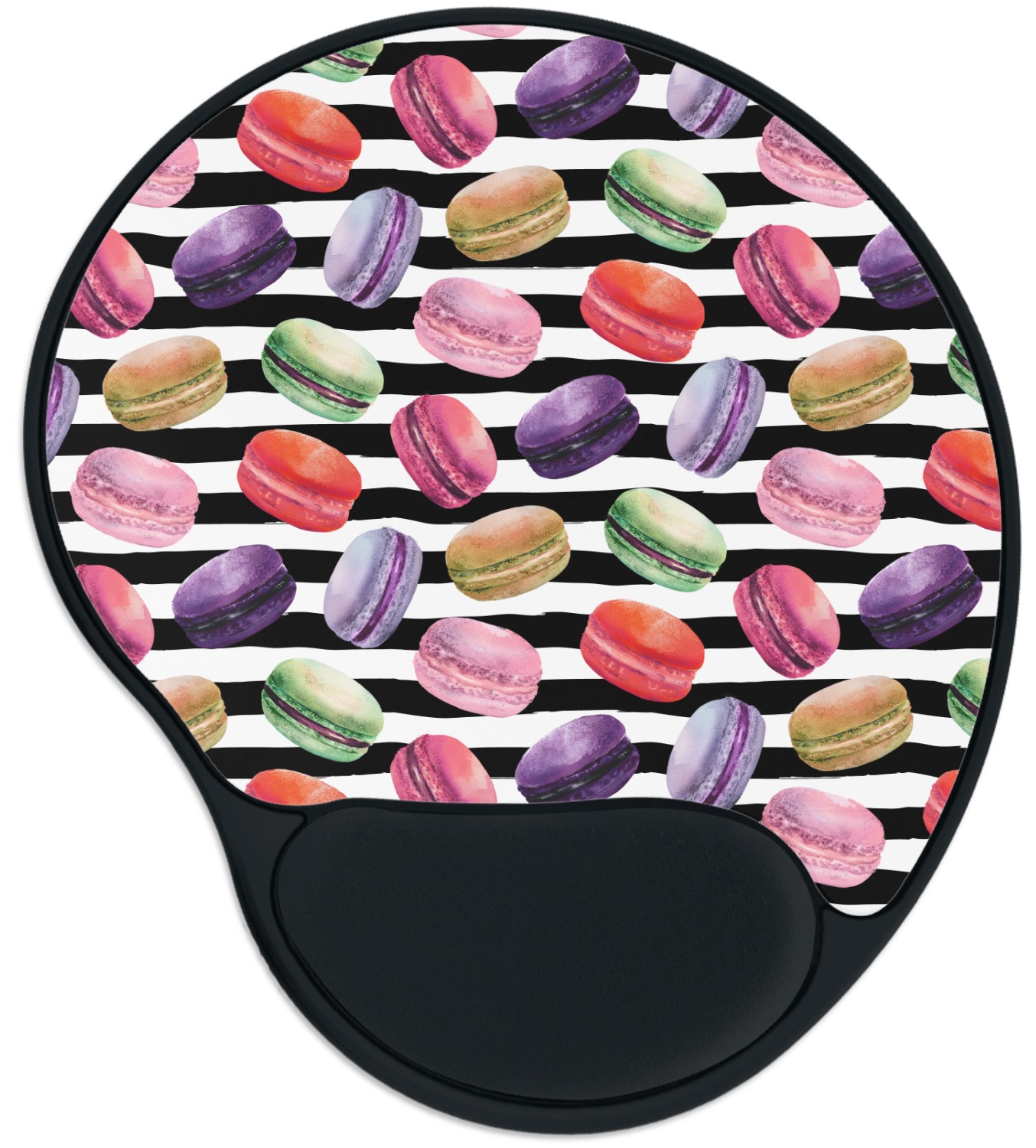 This design simply has the adorable macaron pattern with a striped pattern behind it. You are easily able to add any content you wish to personalize it. The macarons are all different fun colors. You will see green, purple, yellow, red, and pink. The stripes directly behind them are black and white. This design is perfect for any macaron lover or foodie. They will be sure to brighten up your life.