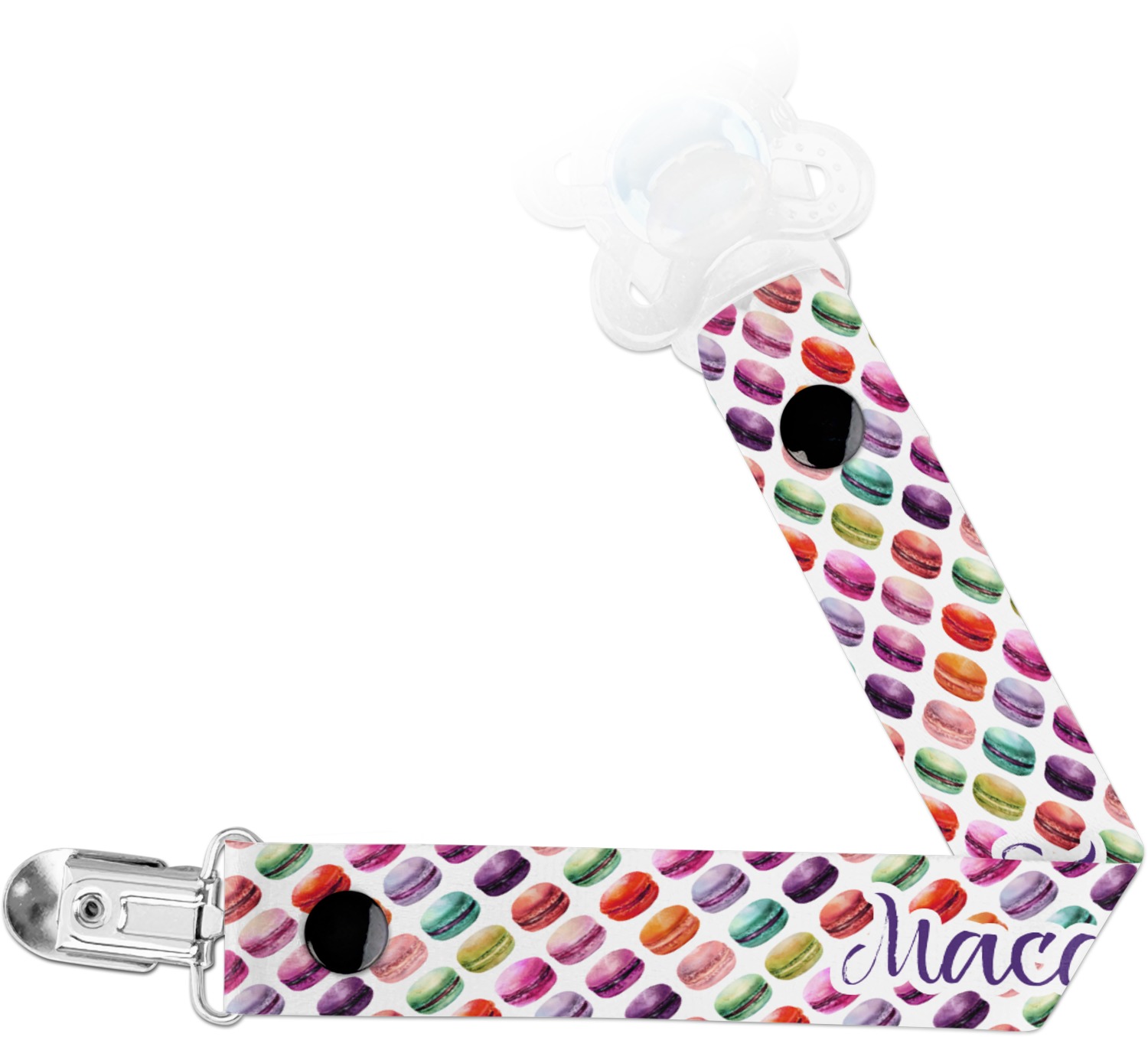 This personalized pacifier clip is the ideal size and measures at approximately 7.5 inches in length, when either end is snapped closed. On one end, you'll find a snap button. This button of your baby's pacifier holder is what can be attached to their pacifier to hold is securely in place. Simply open the snap, slip it through the pacifier opening, and snap it back into place. On the opposite end of this baby pacifier holder, you'll find a metal clip that can secure to a baby's collar or sleeve. This clip ensures that the strap stays in place, and that your baby's pacifier is always on hand.