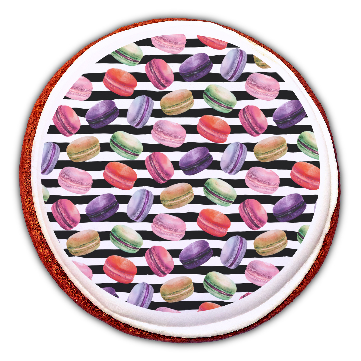 This design simply has the adorable macaron pattern with a striped pattern behind it. You are easily able to add any content you wish to personalize it. The macarons are all different fun colors. You will see green, purple, yellow, red, and pink. The stripes directly behind them are black and white. This design is perfect for any macaron lover or foodie. They will be sure to brighten up your life.