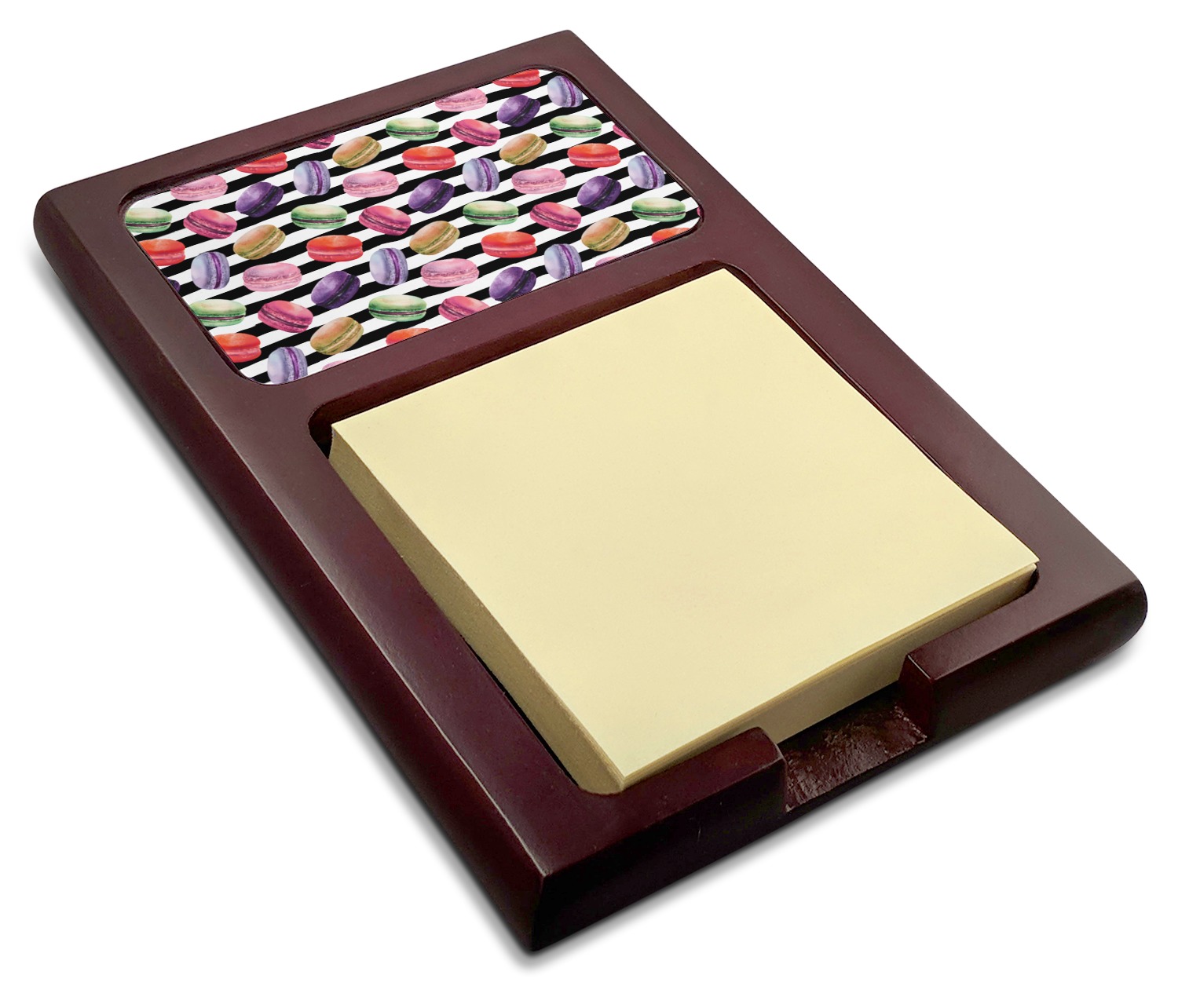 Crafted from a fine mahogany, this post it note holder is in the shade of a dark, cherry color. The dispenser itself is about 4.25 by 6.25 by 0.75 inches. You can place your 3 by 3 inch sticky notes in the indentation below the nameplate. We print your customization onto the nameplate that rests above the velvety indentation.