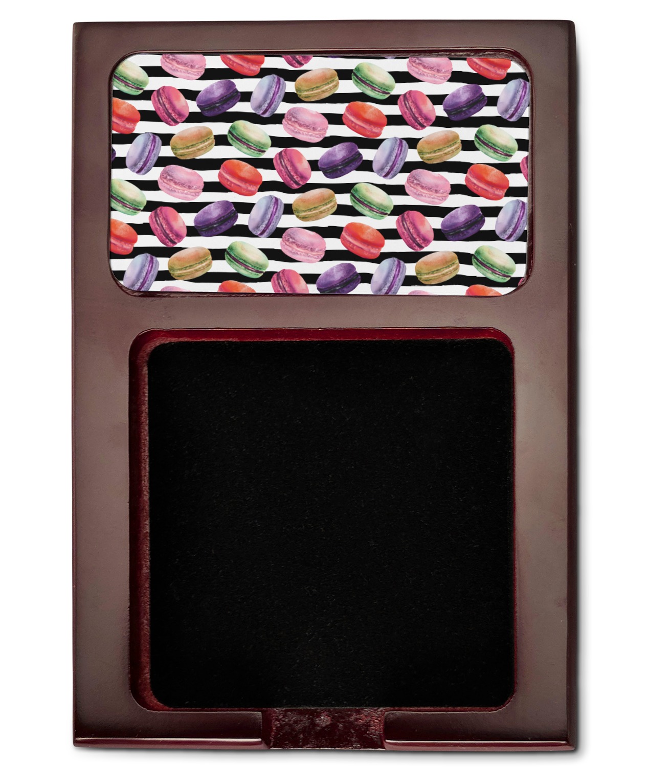 This design simply has the adorable macaron pattern with a striped pattern behind it. You are easily able to add any content you wish to personalize it. The macarons are all different fun colors. You will see green, purple, yellow, red, and pink. The stripes directly behind them are black and white. This design is perfect for any macaron lover or foodie. They will be sure to brighten up your life.