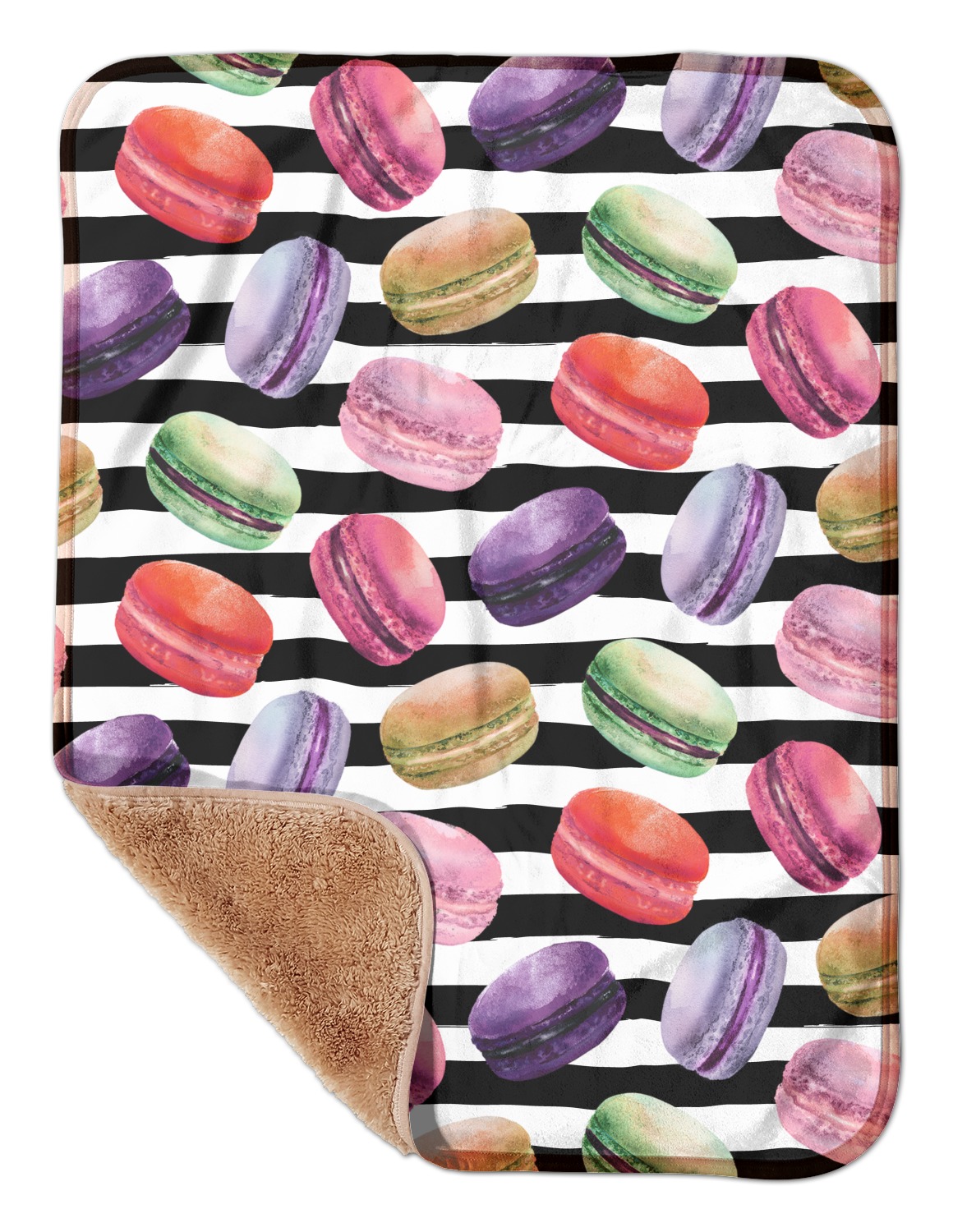This design simply has the adorable macaron pattern with a striped pattern behind it. You are easily able to add any content you wish to personalize it. The macarons are all different fun colors. You will see green, purple, yellow, red, and pink. The stripes directly behind them are black and white. This design is perfect for any macaron lover or foodie. They will be sure to brighten up your life.