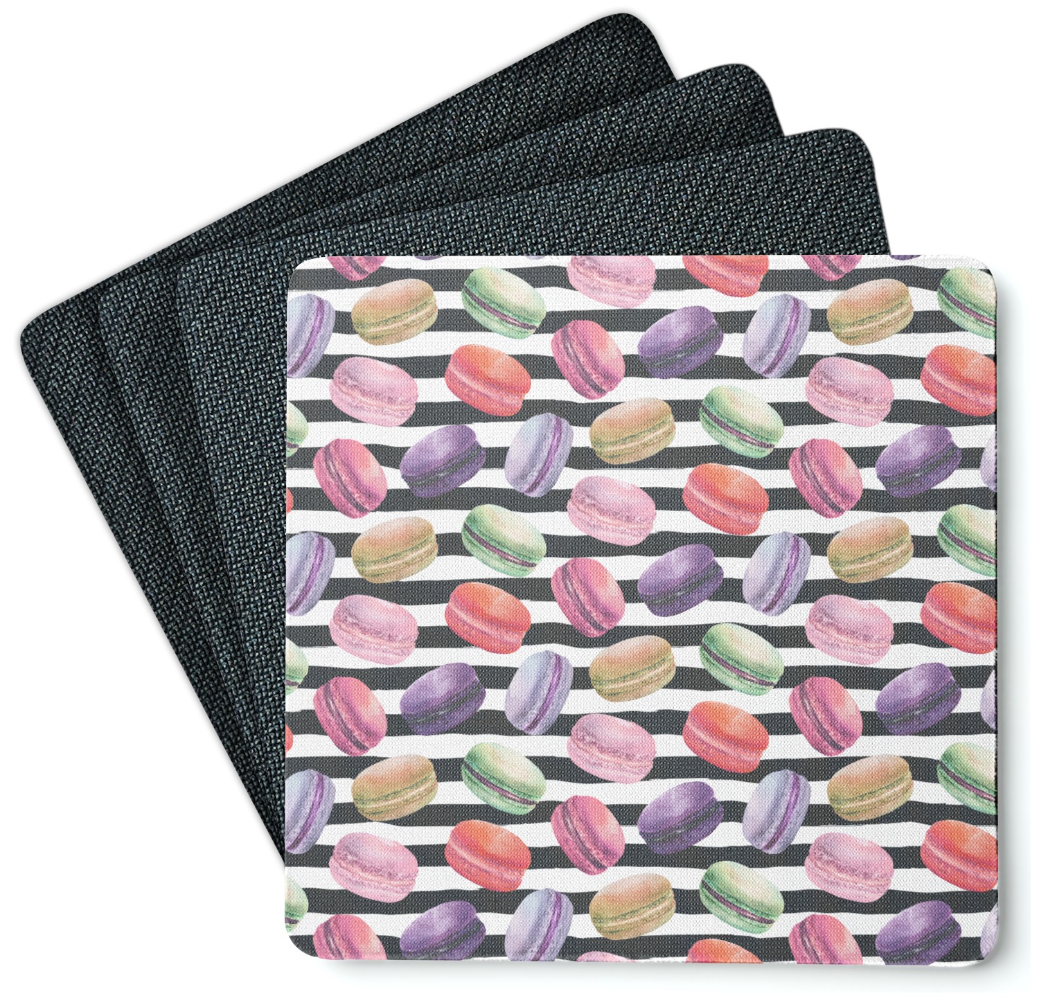These drink coasters have a smooth, polyester top and a textured, rubber backing on its bottom. The non-slip rubber backing underneath works to keep any spills at bay. At 4 by 4 by 0.25 inches thick, these custom coasters are a suitable size for most drinkware. Your personalization is displayed atop the face of the cup coaster. We sell these rubber coasters in two different shapes: square and round. You can buy each shape as singulars or as a set of 4.