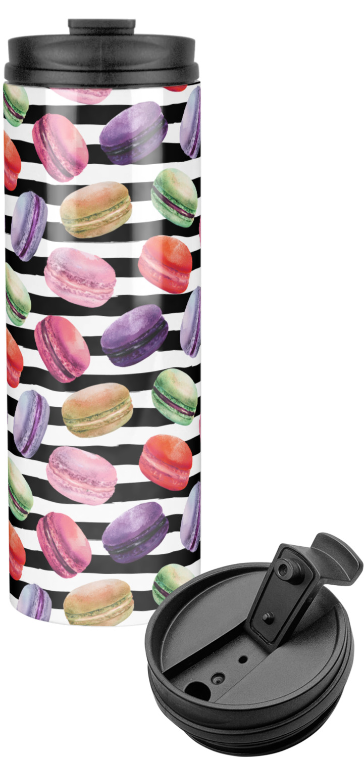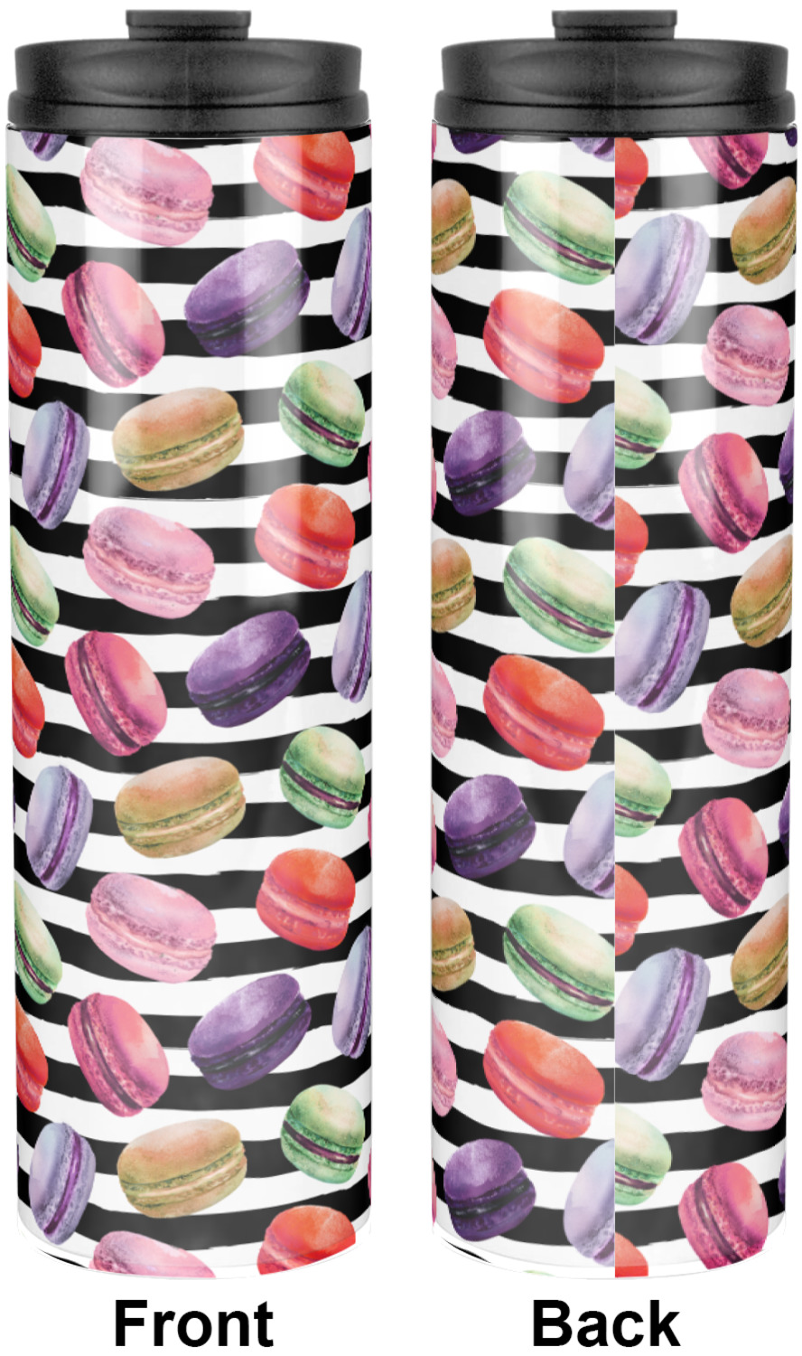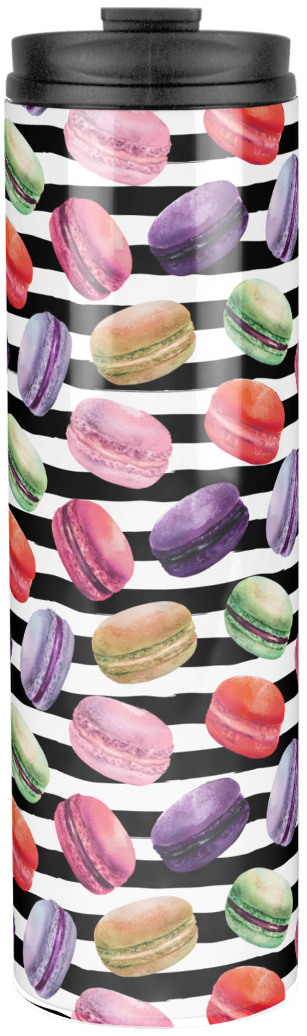 This design simply has the adorable macaron pattern with a striped pattern behind it. You are easily able to add any content you wish to personalize it. The macarons are all different fun colors. You will see green, purple, yellow, red, and pink. The stripes directly behind them are black and white. This design is perfect for any macaron lover or foodie. They will be sure to brighten up your life.