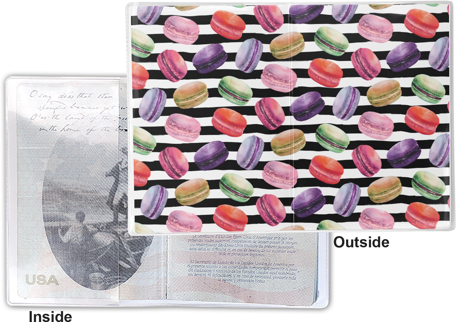 This cover is made of a sturdy clear vinyl with a personalized vinyl insert inside. There is a large and a small pocket on either side to hold the covers of your passport easily and firmly. The passport holder is approximately 7.5" x 5.25", the perfect size to snugly fit your passport. This slim cover is the perfect way to protect your passport without being one more bulky item you have to carry.
